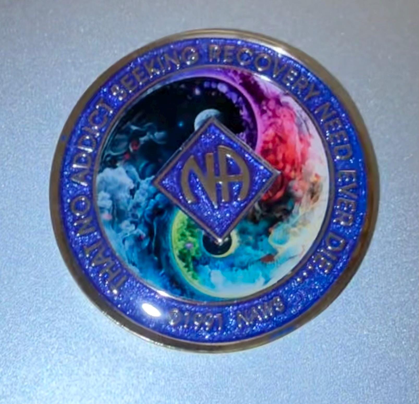 Our galaxy-themed NA (Narcotics Anonymous) medallions showcase a mesmerizing yin-yang cosmic design, making them a distinctive way to celebrate your recovery milestones. The swirling galaxies forming the yin-yang symbolize the balance, harmony, and inner peace cultivated through the recovery journey. Beyond being a token, this medallion serves as a powerful reminder of your strength, resilience, and dedication to sobriety.