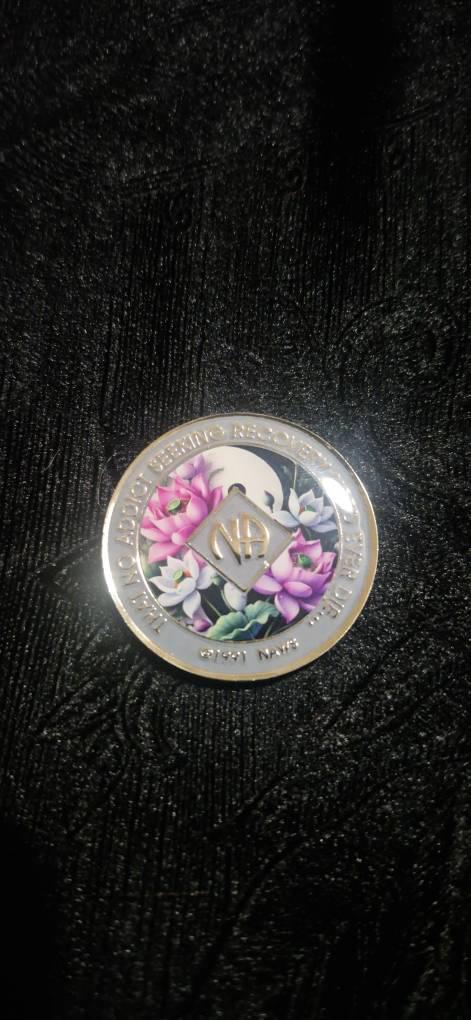 Our lotus flower-themed NA medallions offer a beautiful way to mark recovery milestones. Showcasing a vibrant display of lotus blossoms in shades of pink, white, and purple, this medallion symbolizes the purity, resilience, and personal growth that flourish along the journey of recovery.