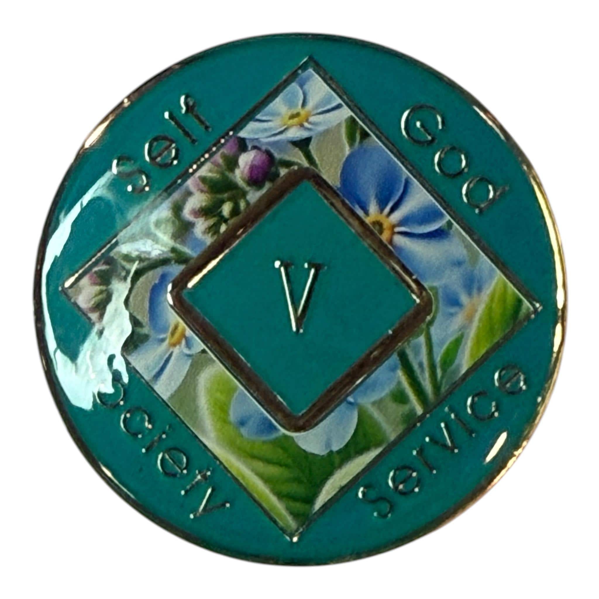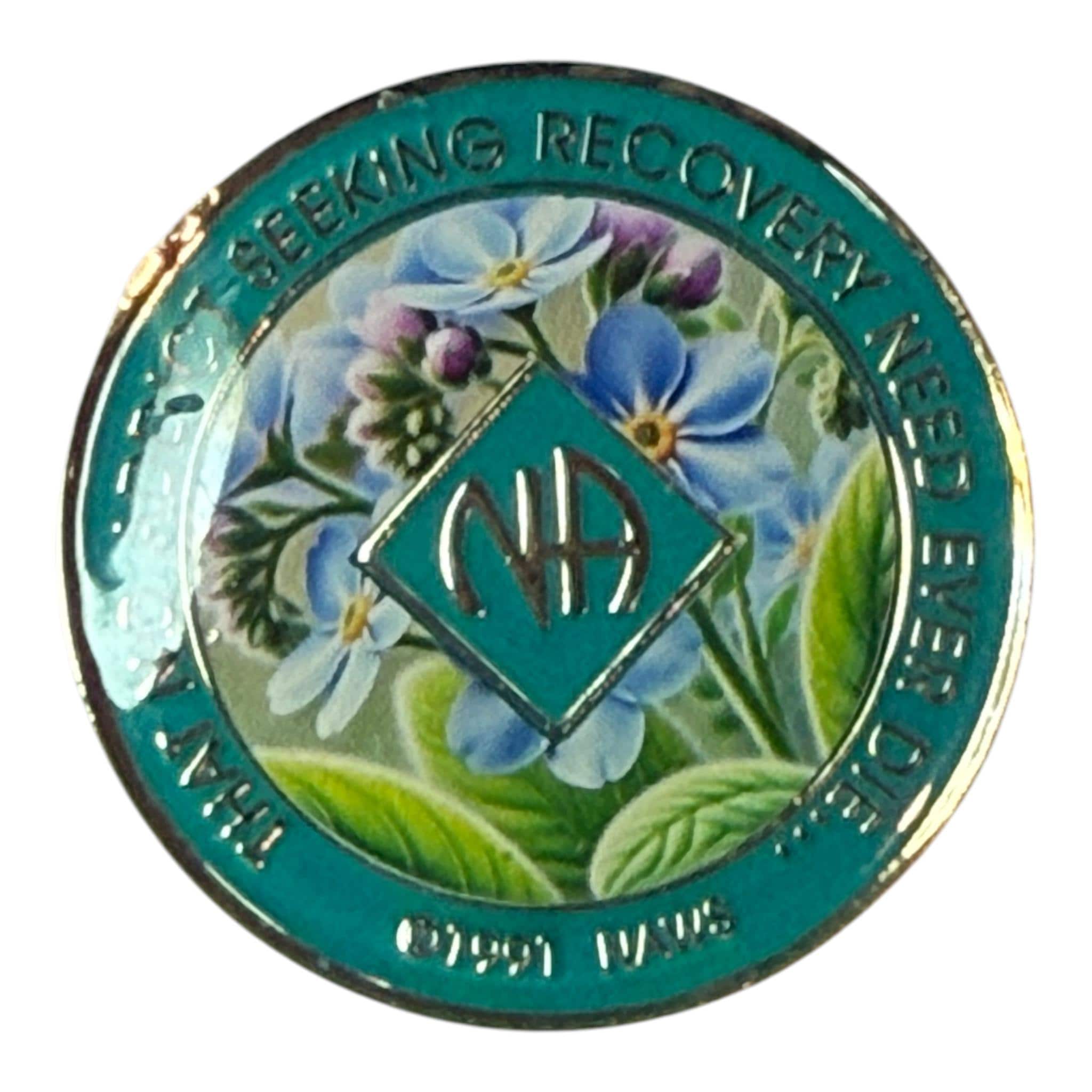 Narcotics Anonymous medallion, forget-me-not recovery chip, NA token, teal recovery coin, floral Narcotics Anonymous gift, sobriety milestone token, recovery anniversary medallion, custom NA medallion, forget-me-not symbolism in recovery, teal enamel NA coin