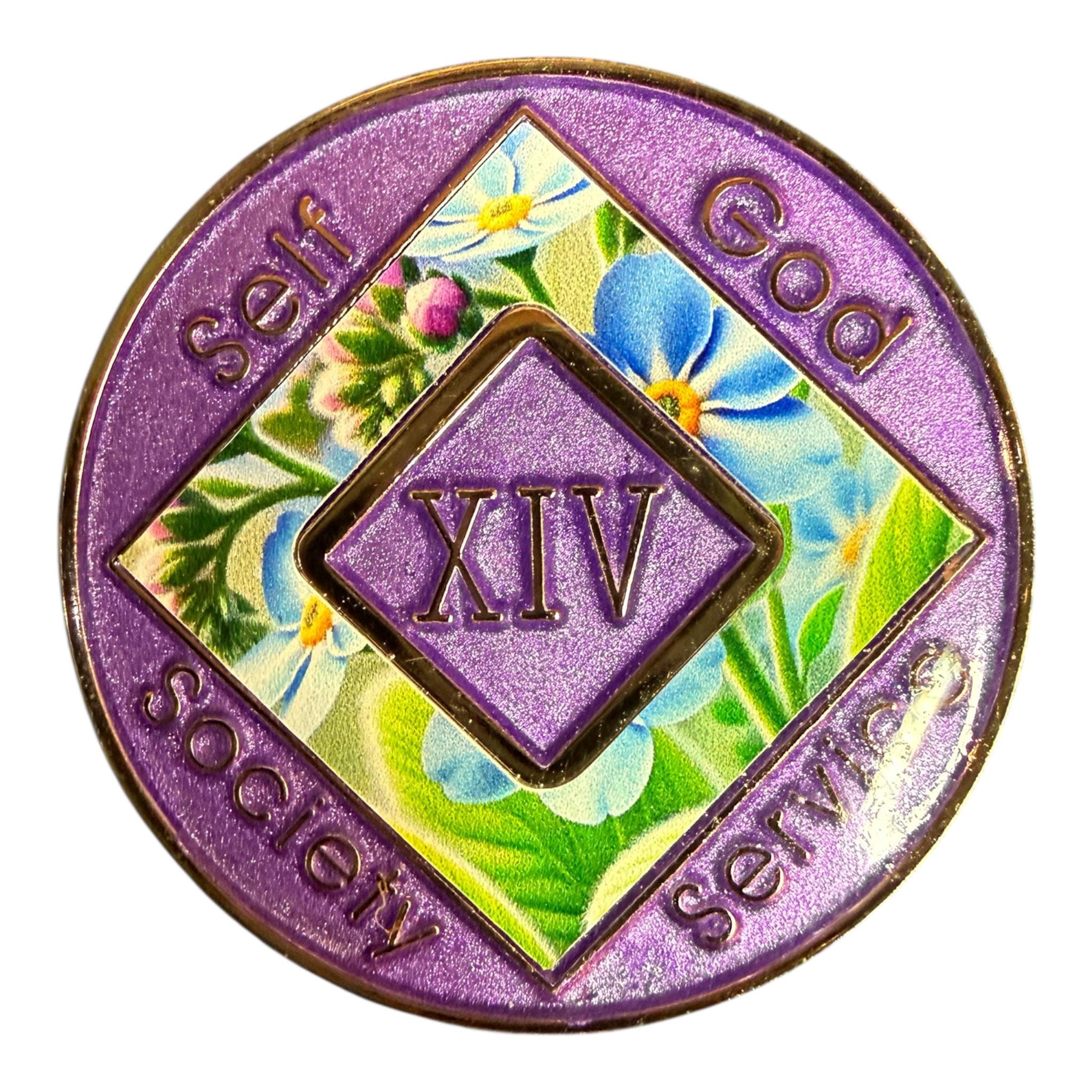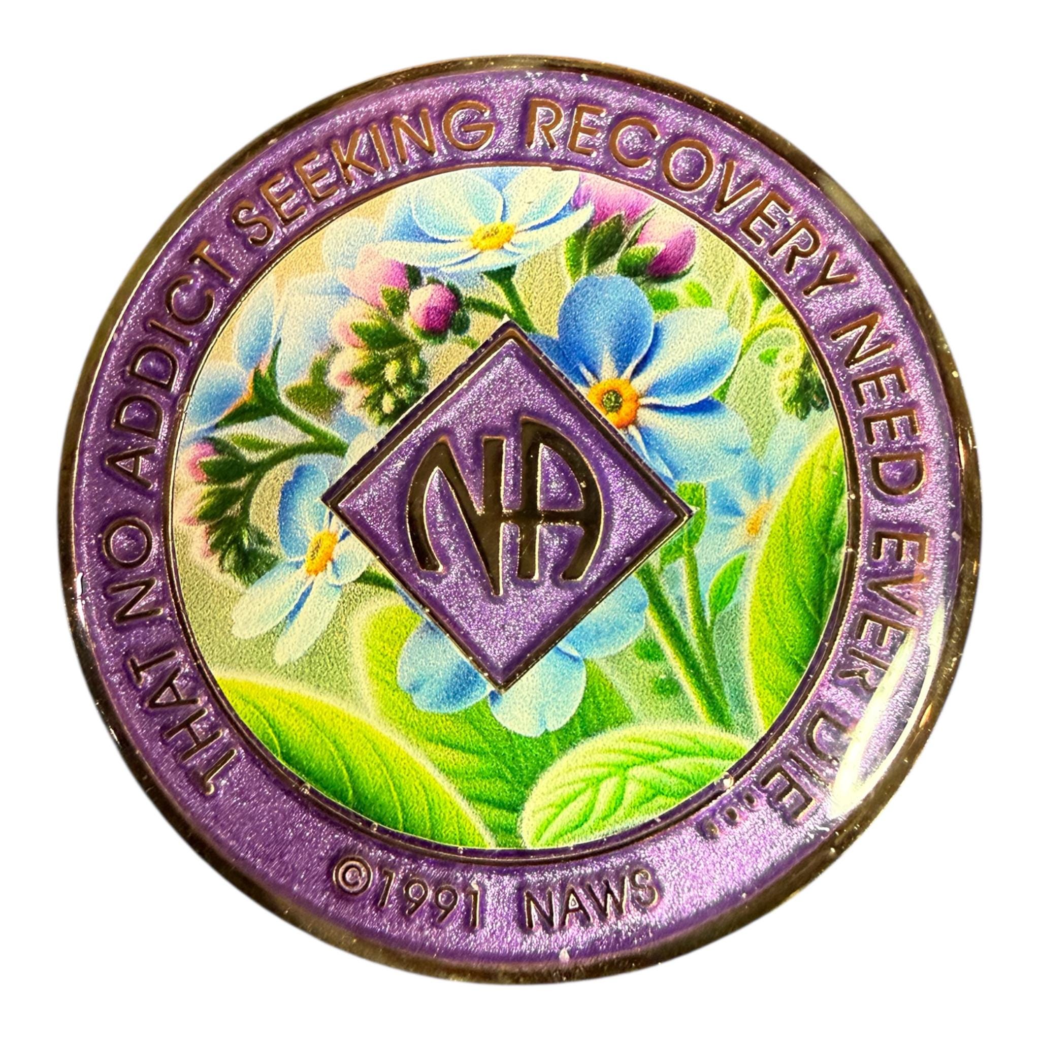 Celebrate recovery with this stunning Narcotics Anonymous Coin featuring a vibrant forget-me-not floral design. Symbolizing remembrance and hope, the delicate blue and purple blossoms are beautifully set against a shimmering metallic teal background, creating a captivating visual statement of strength and growth.