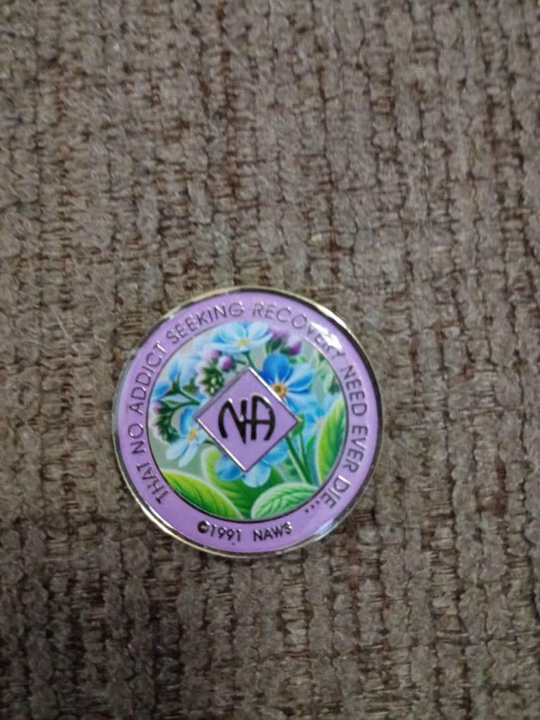 Celebrate recovery with this stunning Narcotics Anonymous medallion featuring a vibrant forget-me-not floral design. Symbolizing remembrance and hope, the delicate blue and purple blossoms are beautifully set against a shimmering metallic teal background, creating a captivating visual statement of strength and growth.