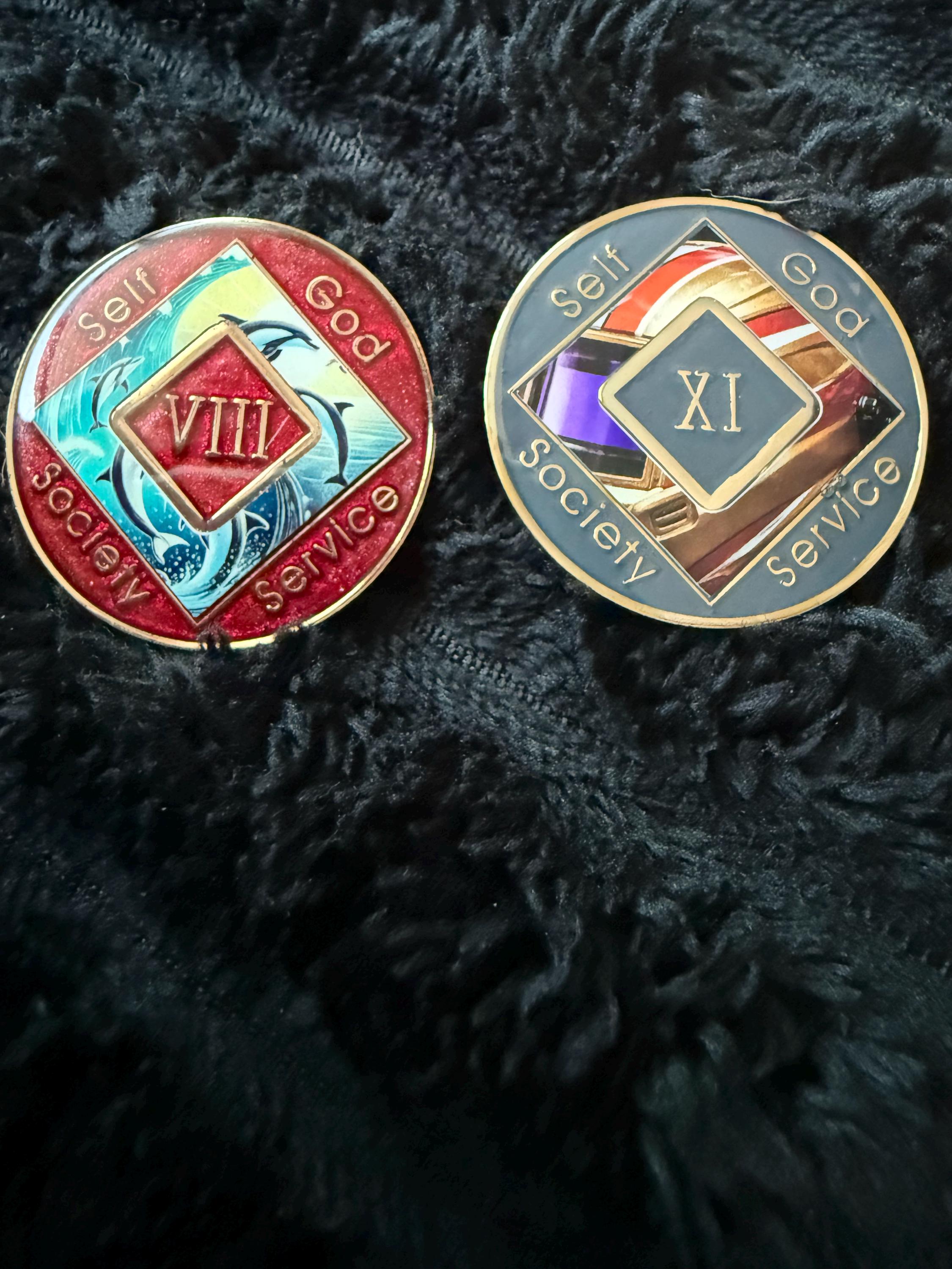 This striking NA medallion showcases a powerful ocean wave and dolphin motif, symbolizing strength, freedom, and the courage to keep moving forward—no matter how rough the waters may feel. Rich deep blue tones paired with a warm golden sky create a bold contrast, capturing both the serenity and resilience discovered in recovery.