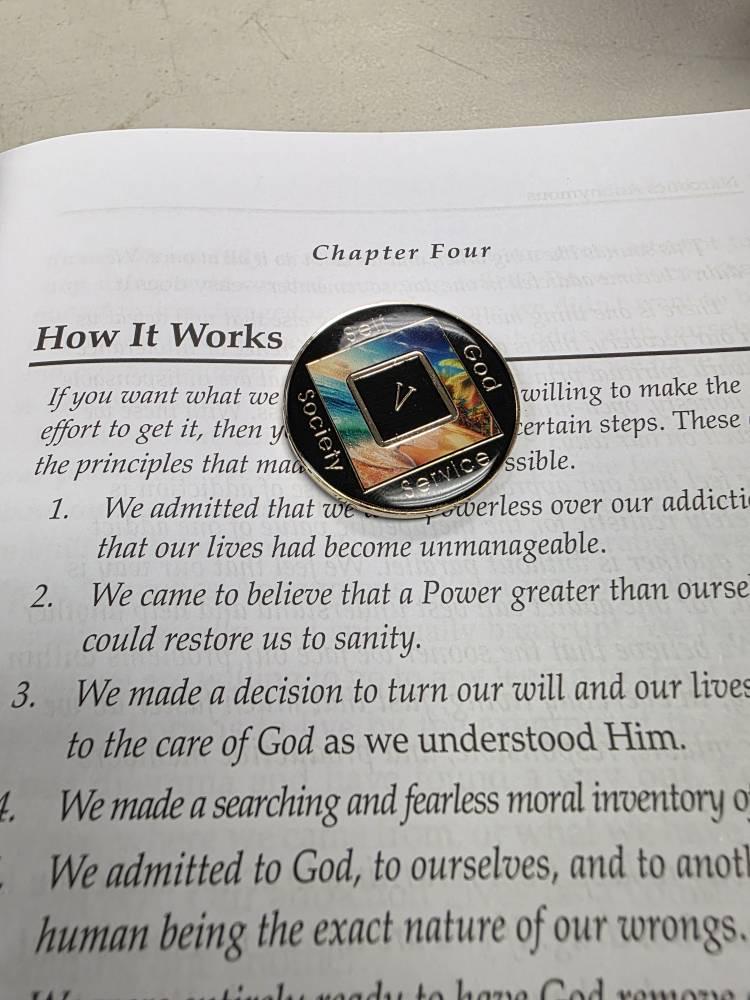✅ Four Spiritual Principles – The reverse side features Self, God, Society, and Service, along with a Roman numeral marking clean time.