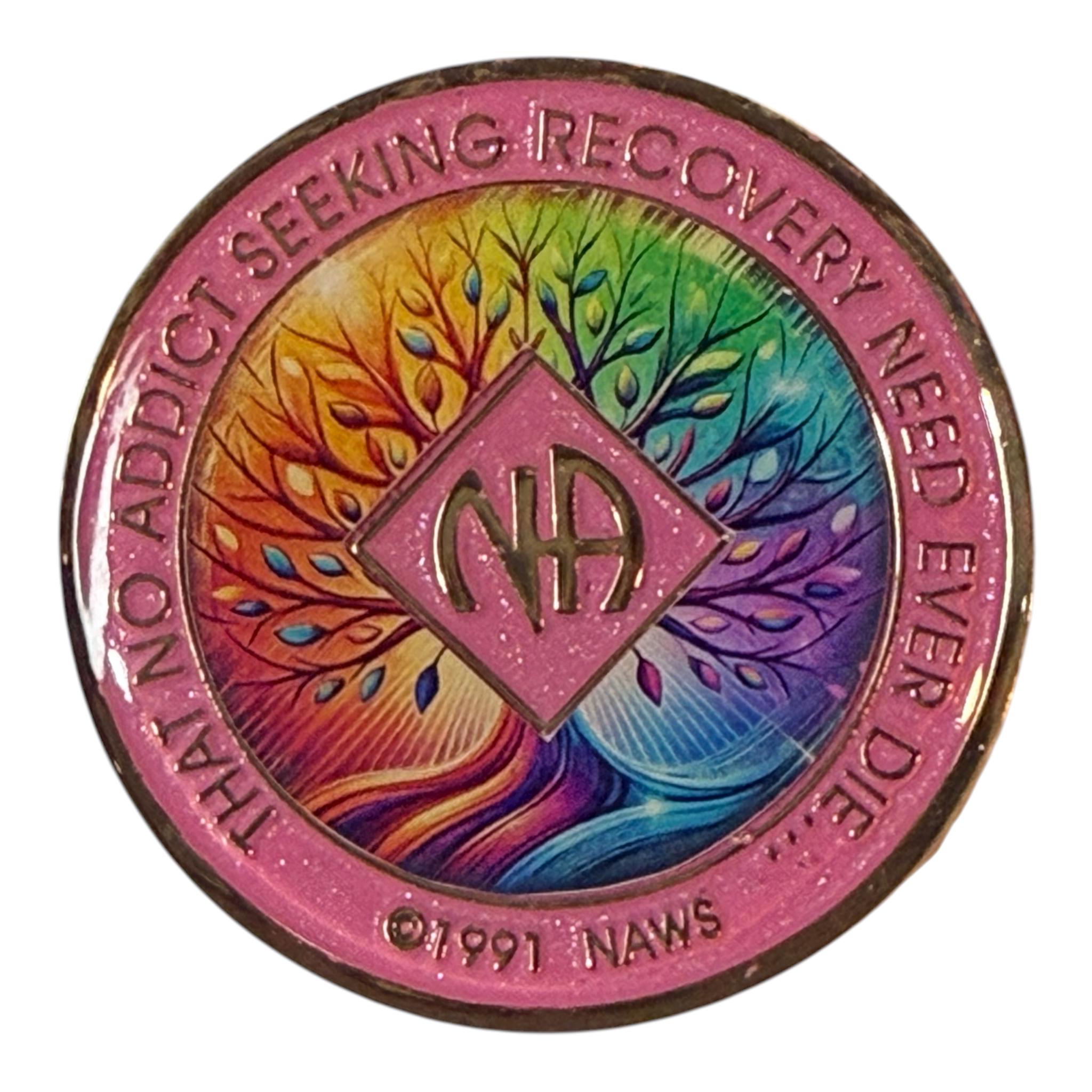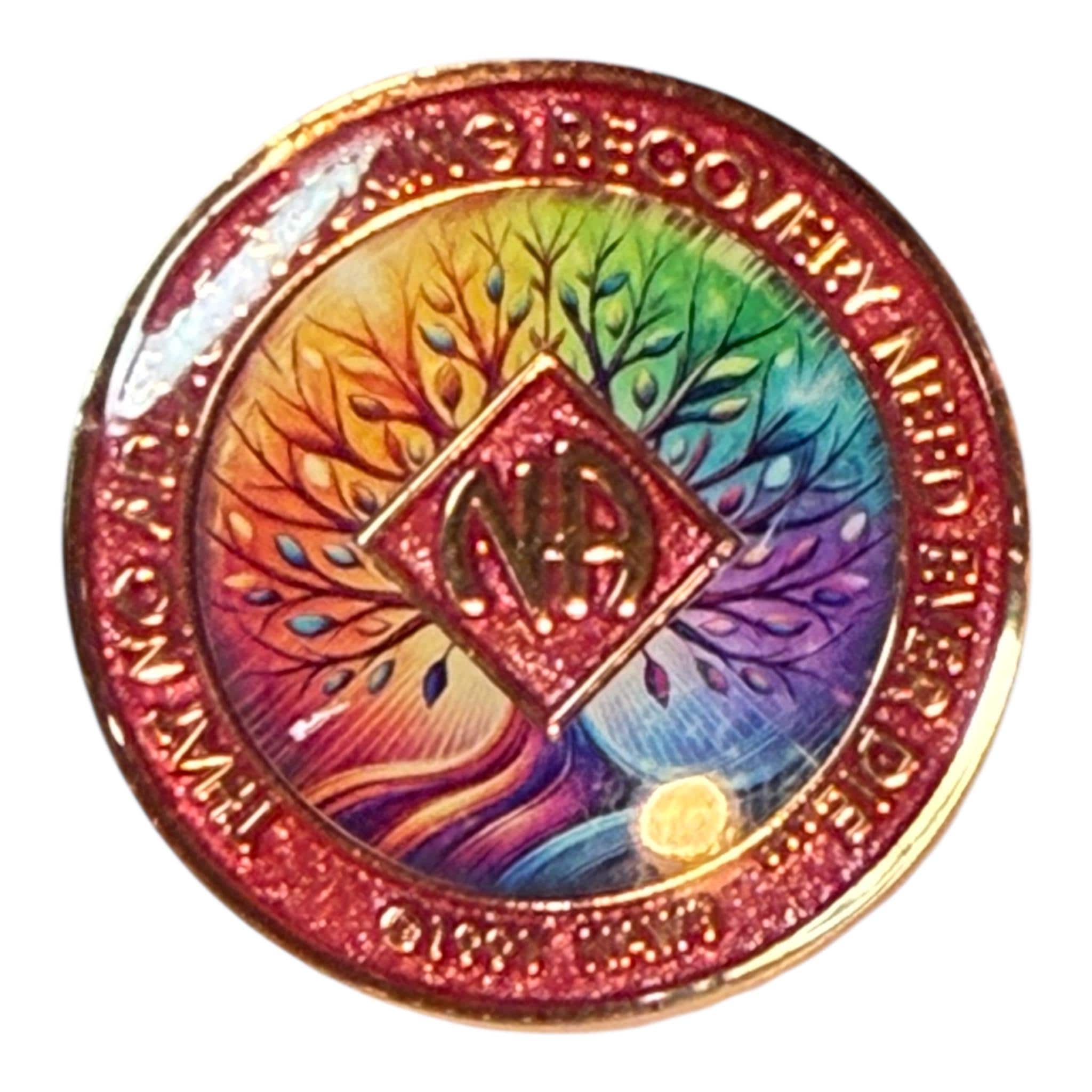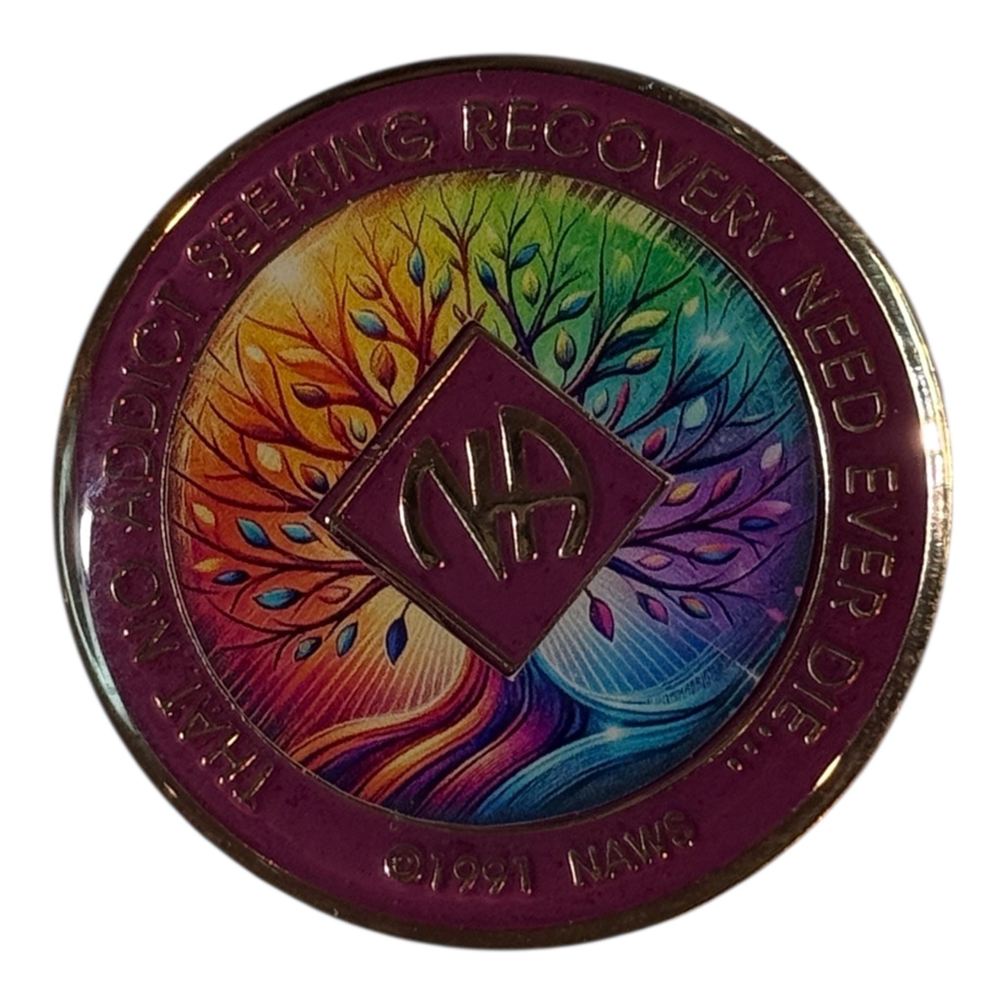 Celebrate your recovery journey with this Tree of Life NA Medallion, a stunning symbol of strength, renewal, and personal growth. Featuring a vibrant, multicolored tree design, this medallion represents the deep roots of recovery and the endless possibilities of a sober life.