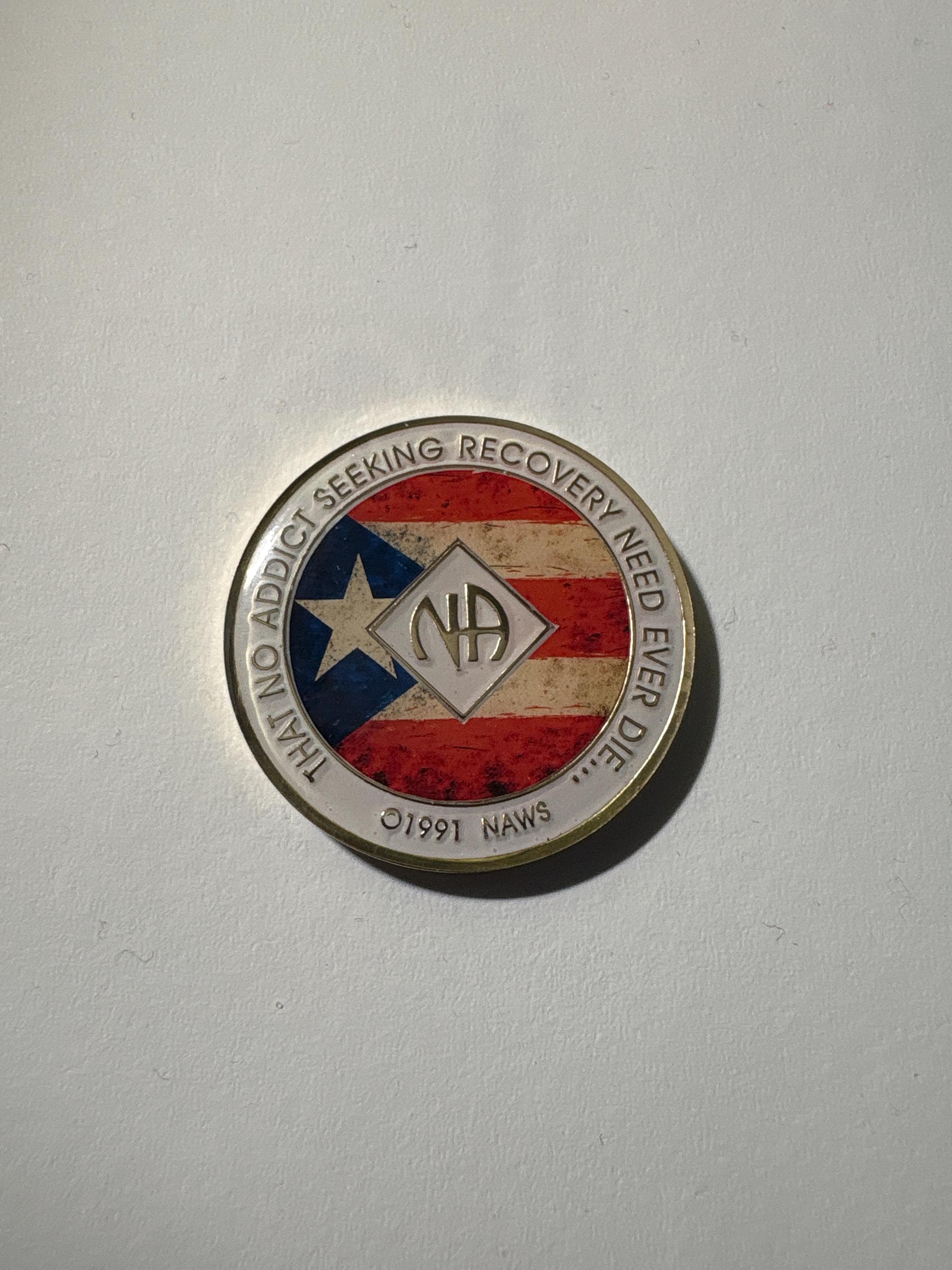Celebrate your clean time with pride, strength, and heritage. This NA medallion showcases the iconic Puerto Rican flag in a distressed, vintage-inspired design—symbolizing resilience, identity, and the powerful connection between culture and the journey of recovery.