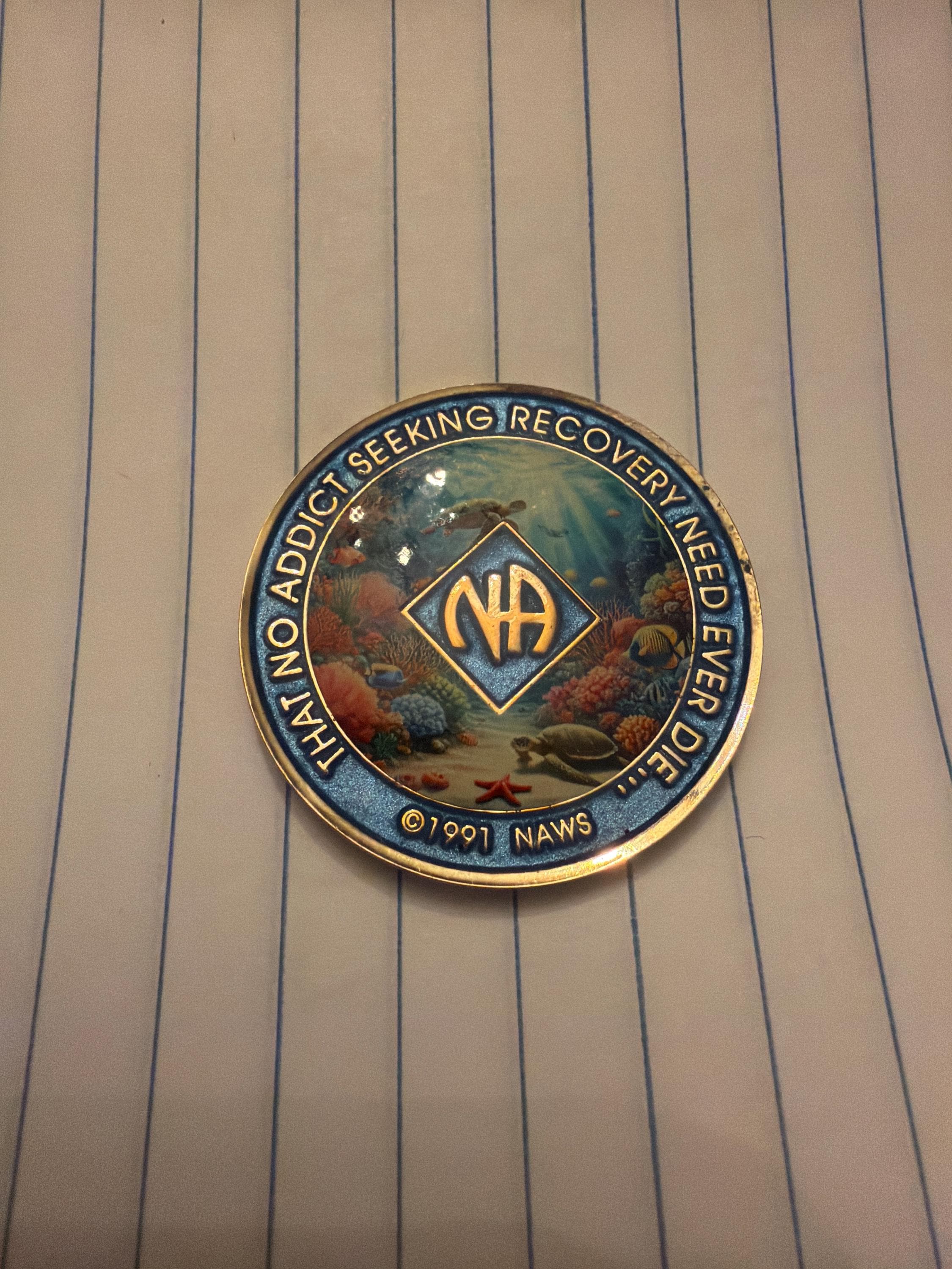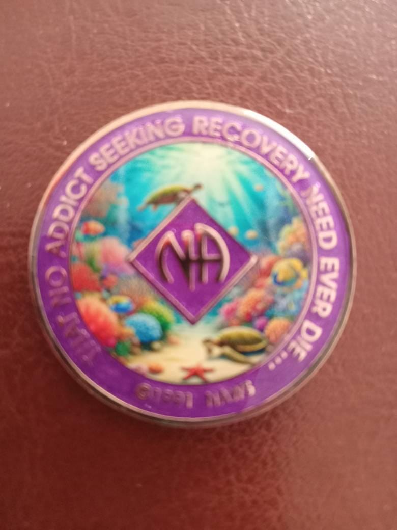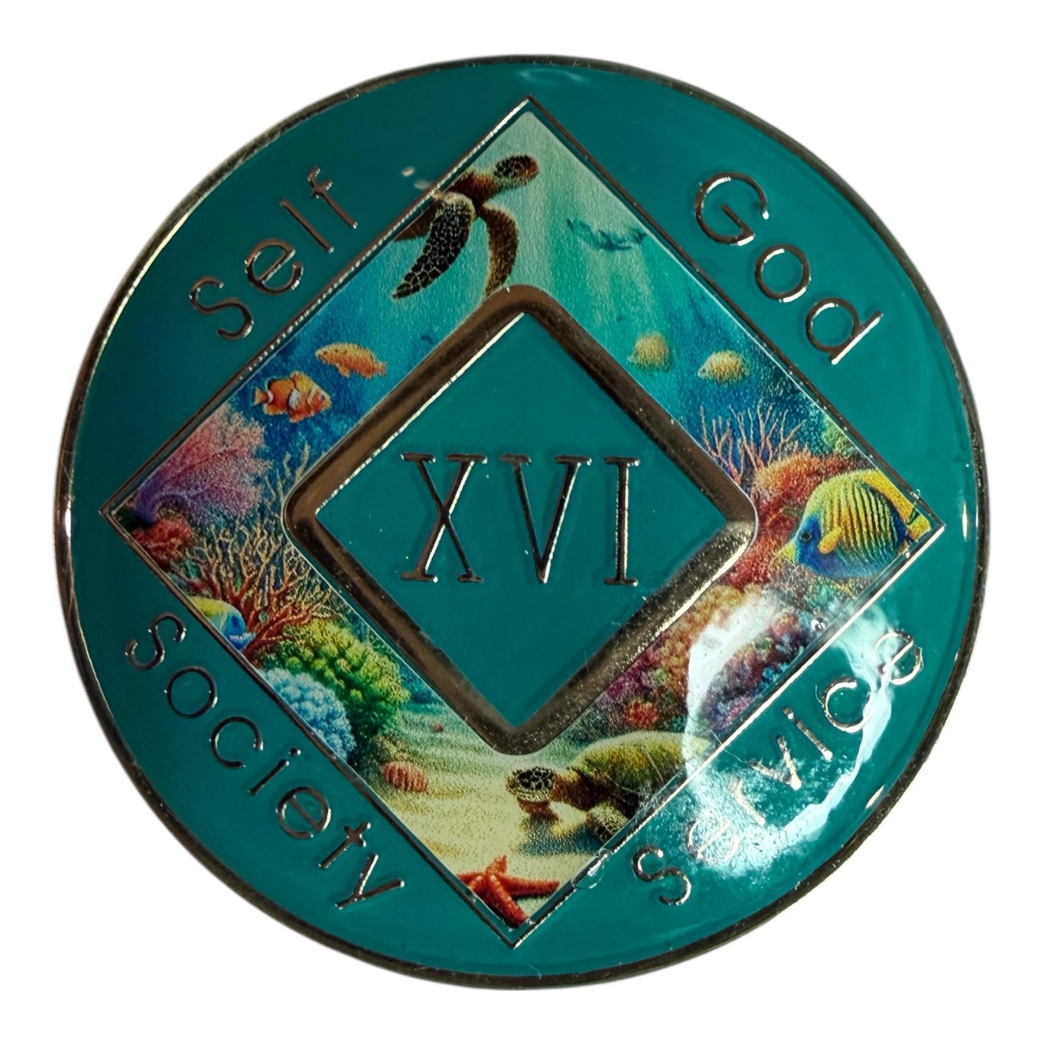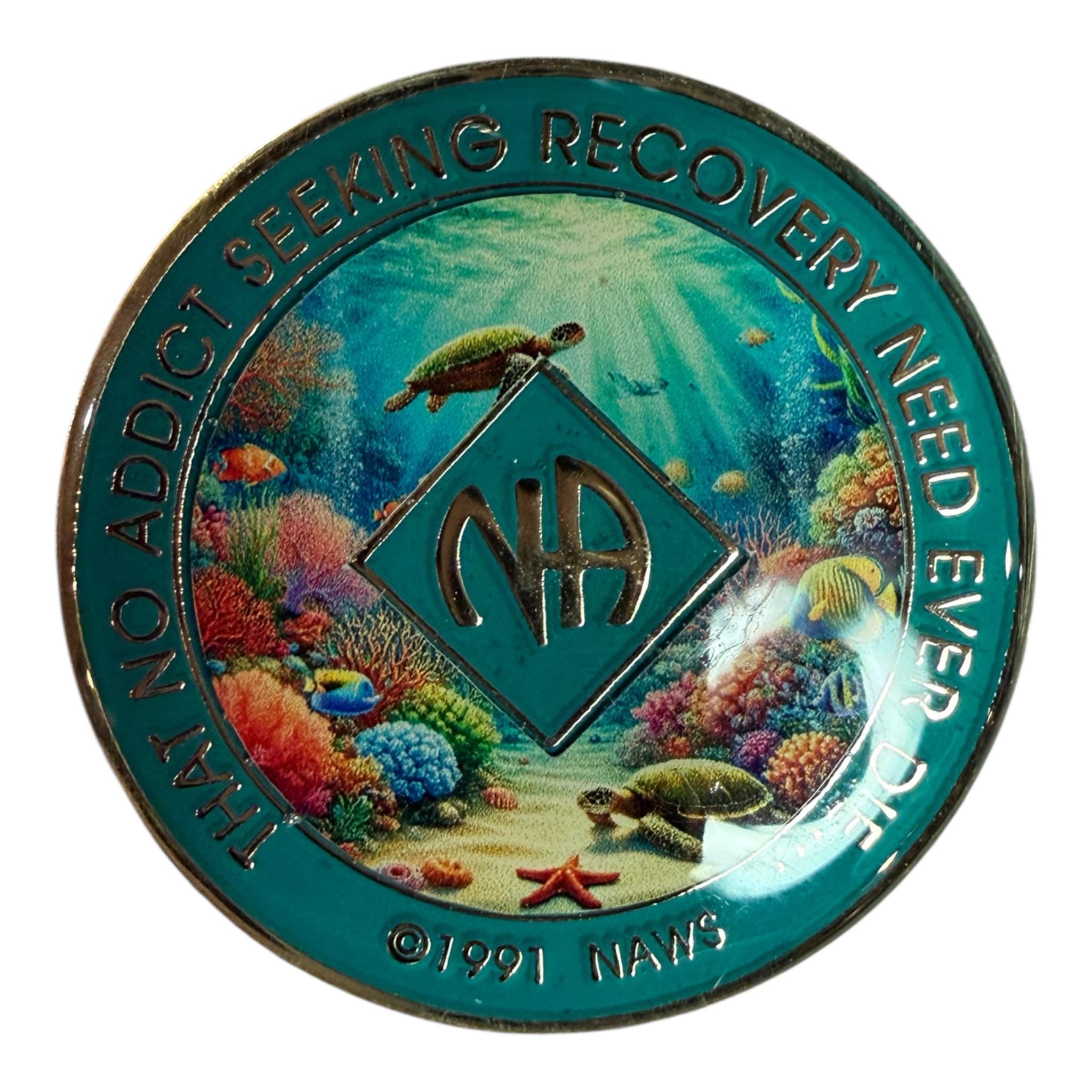 Dive into serenity and celebrate your journey with this beautiful ocean-themed NA medallion. Featuring a peaceful underwater reef scene with sea turtles, coral, and tropical fish, this chip symbolizes patience, resilience, and the calm strength of recovery.