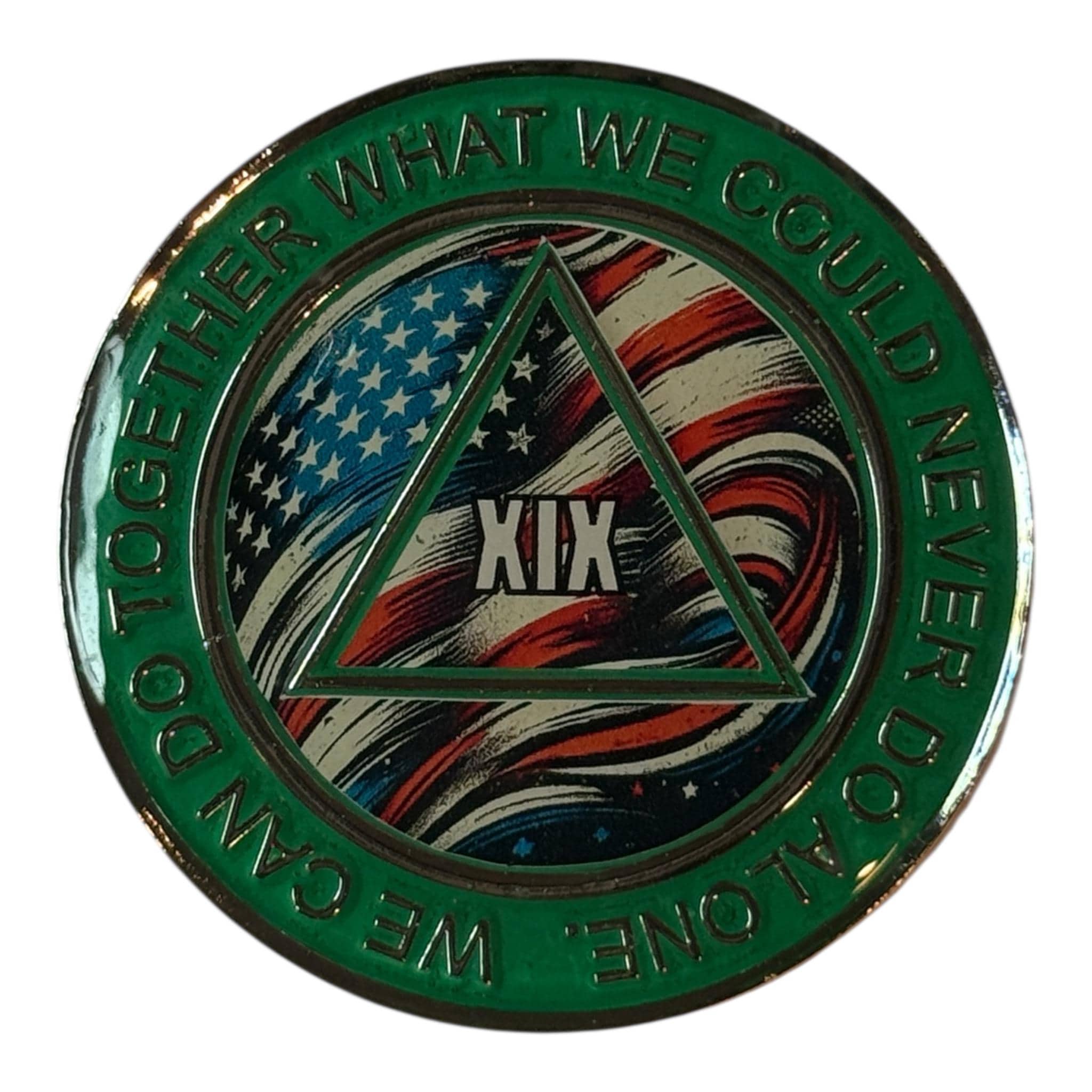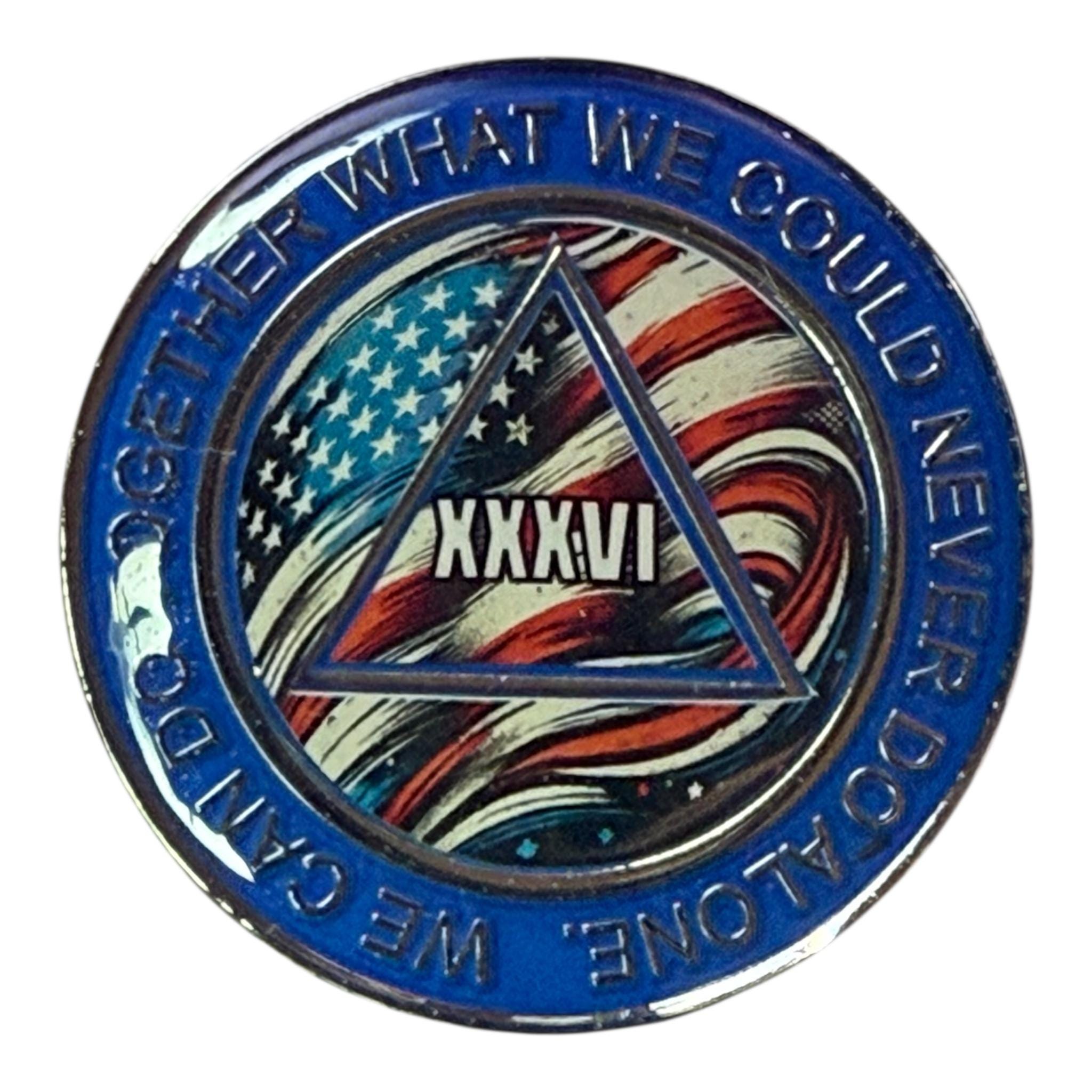 Mark years of strength, healing, and progress with this powerful AA medallion featuring a waving American flag background and bold number in the center triangle. A great chip for anyone who loves their country and their recovery!