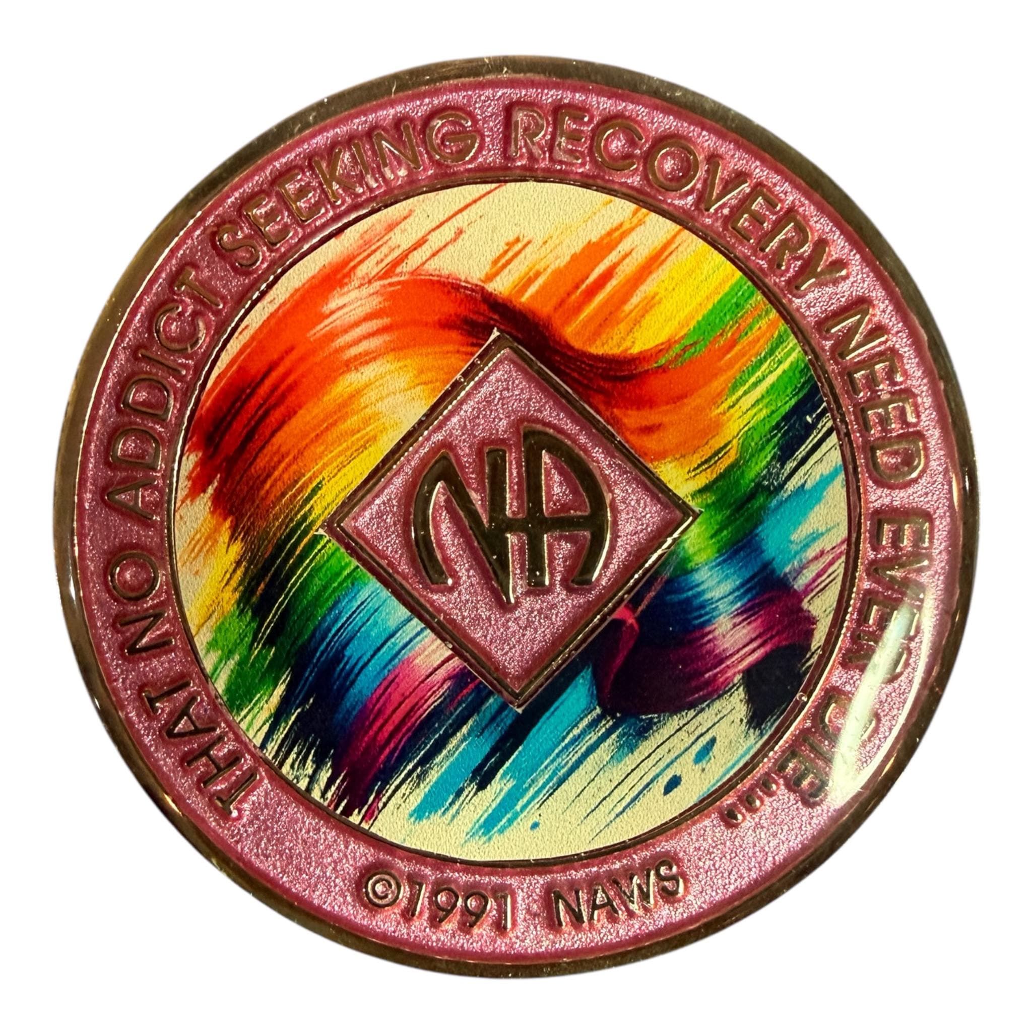 Honor your recovery journey and show your true colors with this vibrant, rainbow-themed NA medallion. With dynamic brushstrokes in every hue across the background, this chip represents individuality, unity, and the powerful growth that comes from embracing who you are.