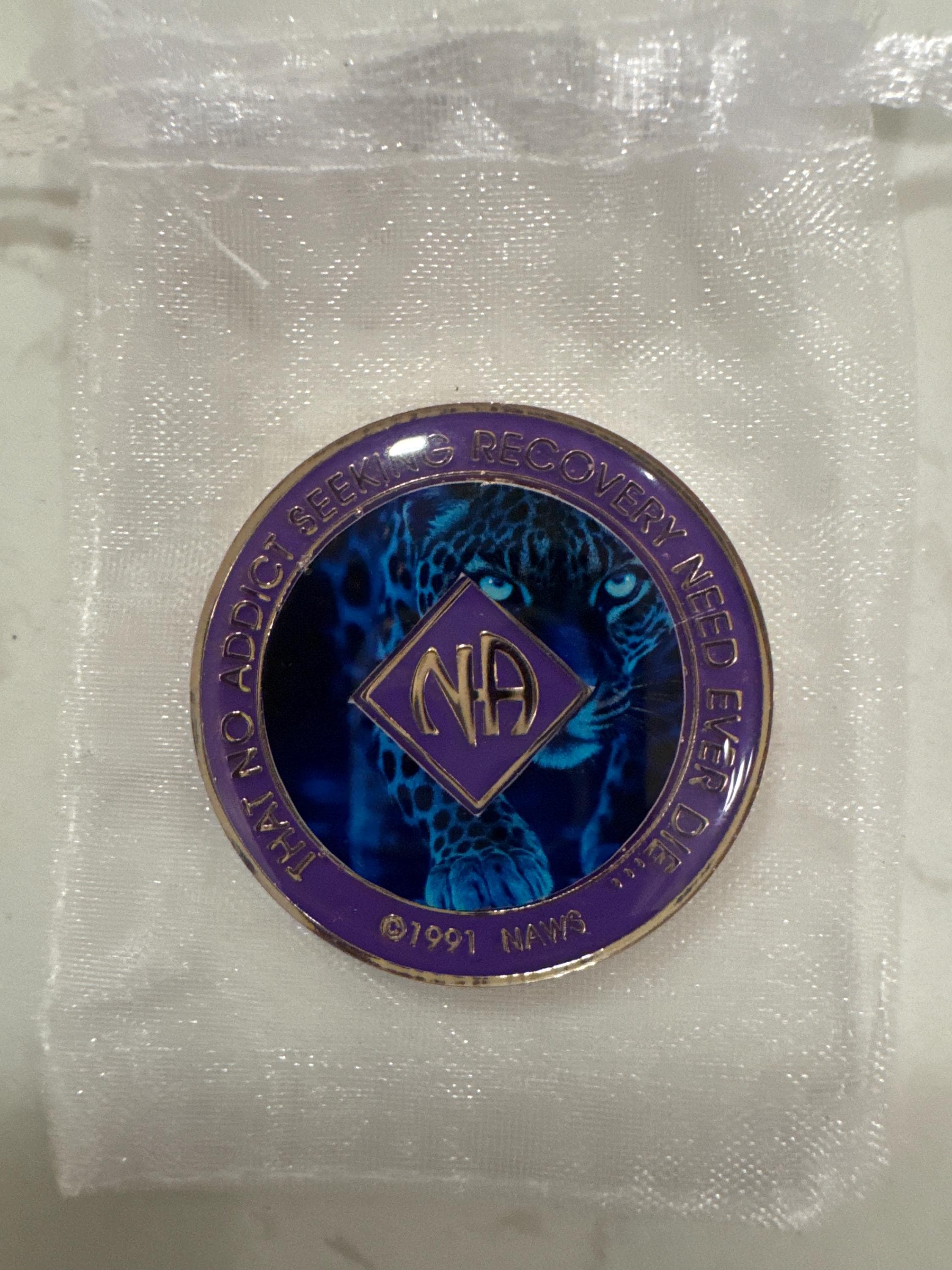 Channel your inner strength with this striking NA medallion featuring a piercing blue leopard and glowing paw print design. This medallion represents resilience, stealth, and quiet power — the kind of strength it takes to fight for recovery, one day at a time.