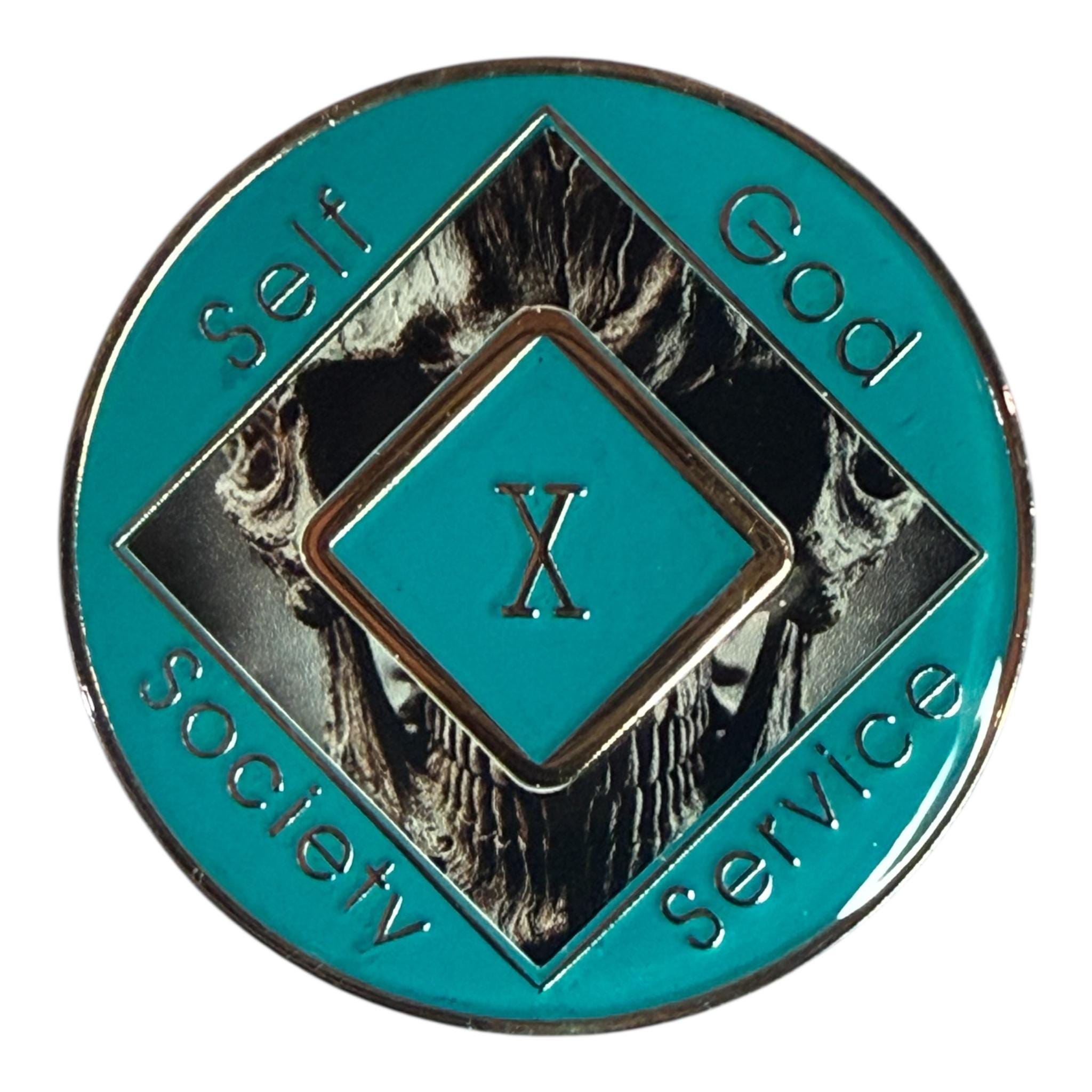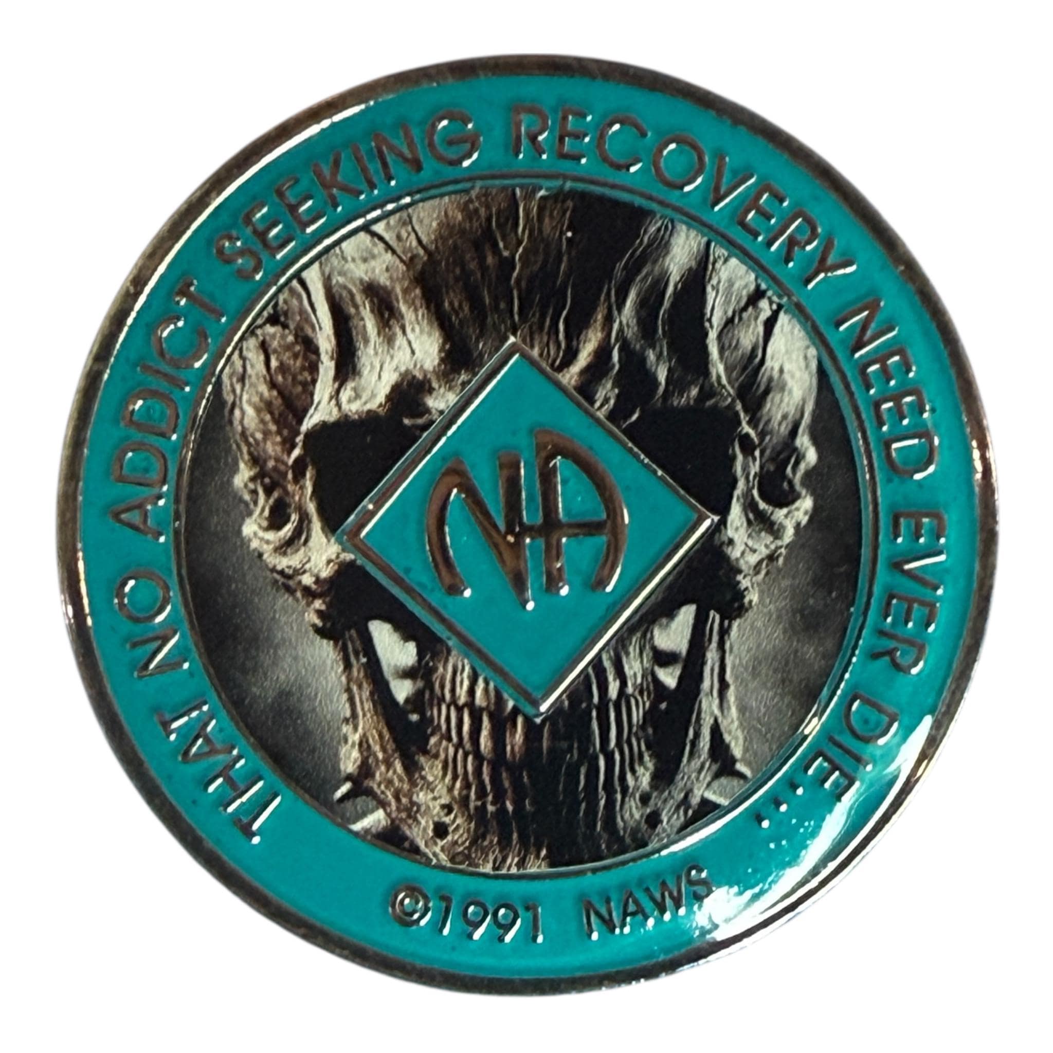 This striking NA token showcases a fierce skull design set against a rugged red and black background—a tribute to the courage and grit of the recovery journey. Bold, unapologetic, and powerful, it reflects the strength and resilience you carry every day.