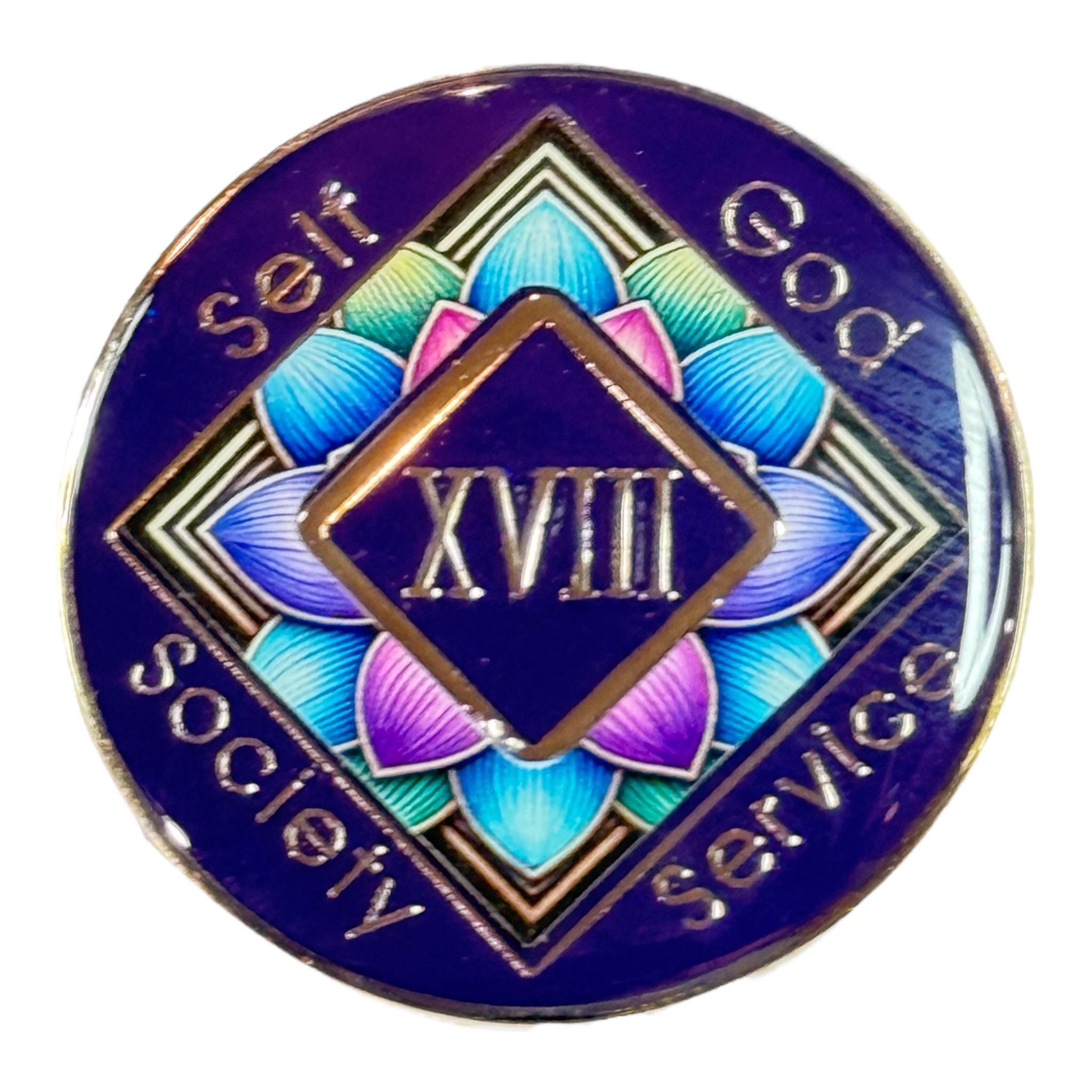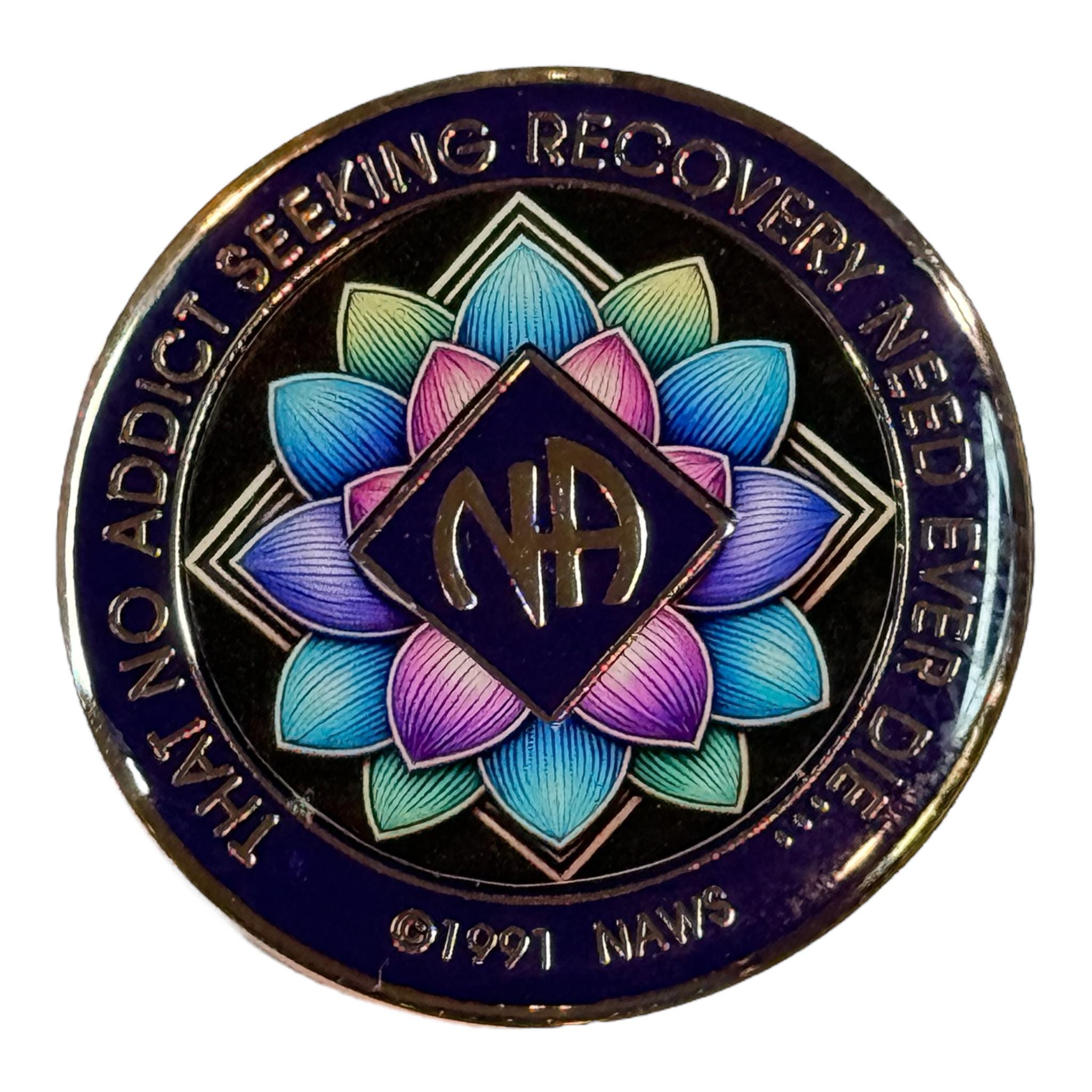 This NA Medallion features a radiant lotus flower, symbolizing growth, transformation, and spiritual awakening. The rich purple background and teal-toned petals create a striking and calming visual, perfect for honoring the inner journey of recovery.