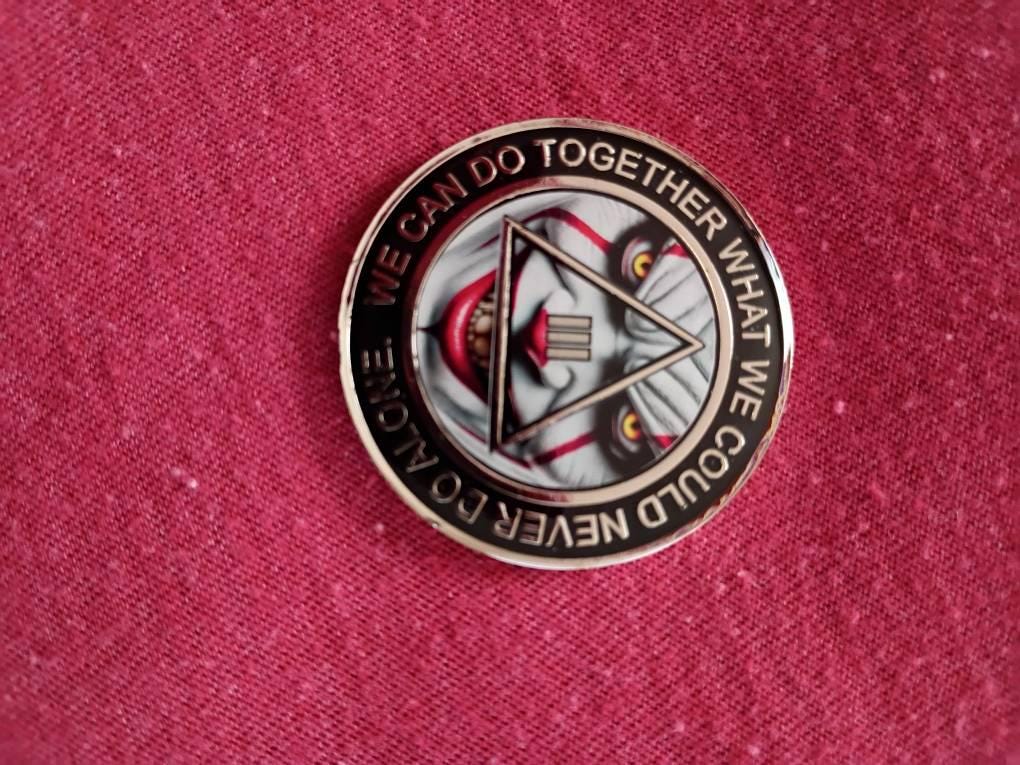 This striking AA medallion features a bold and eerie clown face design, perfect for those who’ve faced their fears and come out stronger. With vivid details and intense eyes, this medallion is a symbol of resilience, transformation, and personal power.