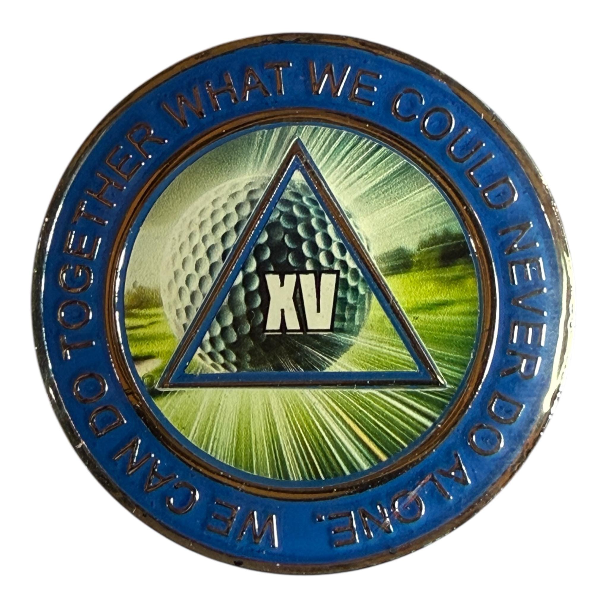 This custom AA medallion features a high-flying golf ball captured mid-flight over a vibrant, scenic course—perfect for celebrating progress and staying on course in your recovery journey. The front bears the timeless AA phrase: “We can do together what we could never do alone” and a clean-time year of your choice.