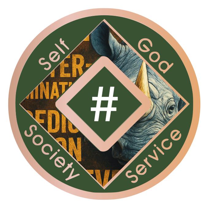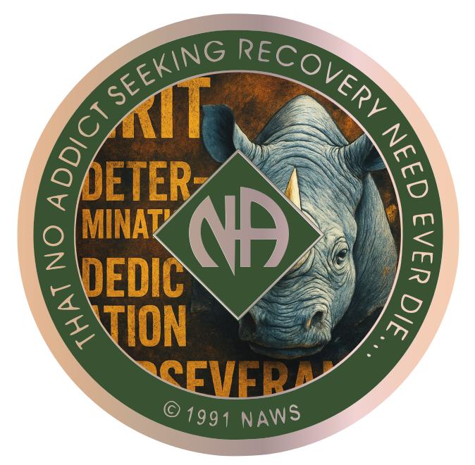 This medallion includes your clean time number placed in the center on the front, with the traditional NA diamond on the back, surrounded by inspirational words like Self, God, Society, and Service. The rhino artwork represents determination, grit, and forward movement—perfect for honoring a milestone in recovery.