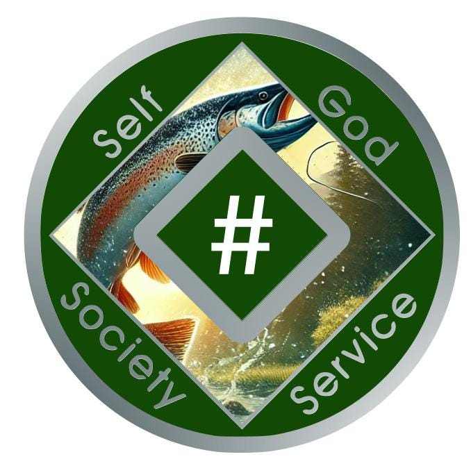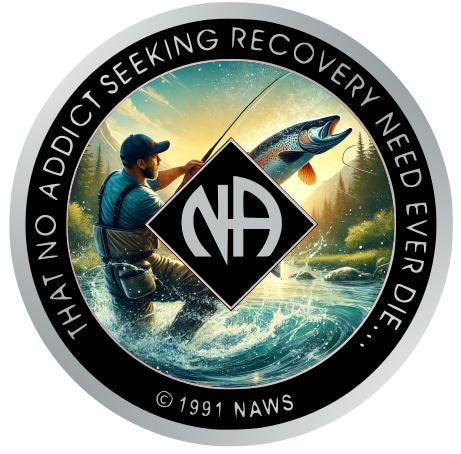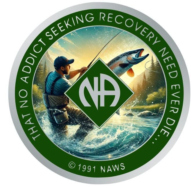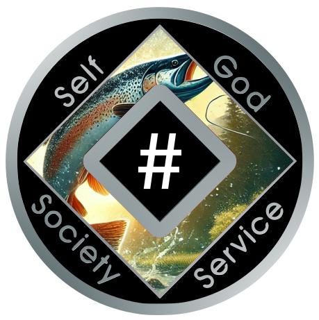 Designed for the angler in recovery, this handcrafted 34mm Narcotics Anonymous medallion captures the spirit of freedom, patience, and persistence. The front features a peaceful fly fishing scene — a symbol of focus and connection with nature — while the reverse shows a vibrant trout breaking the surface, framed by the four pillars: Self, God, Society, Service.