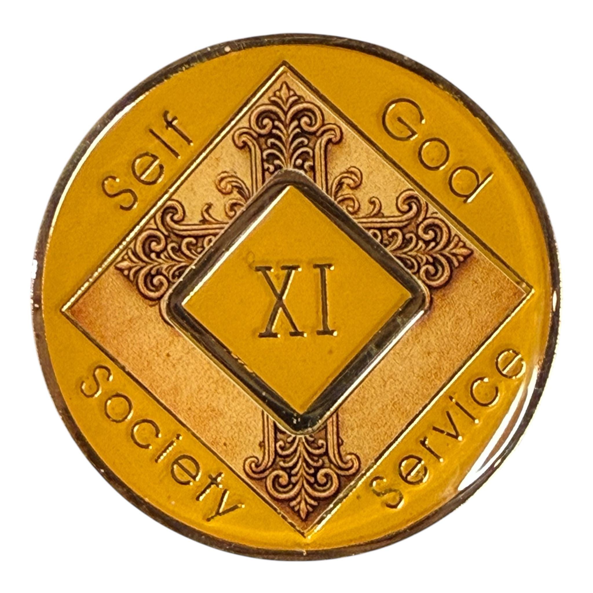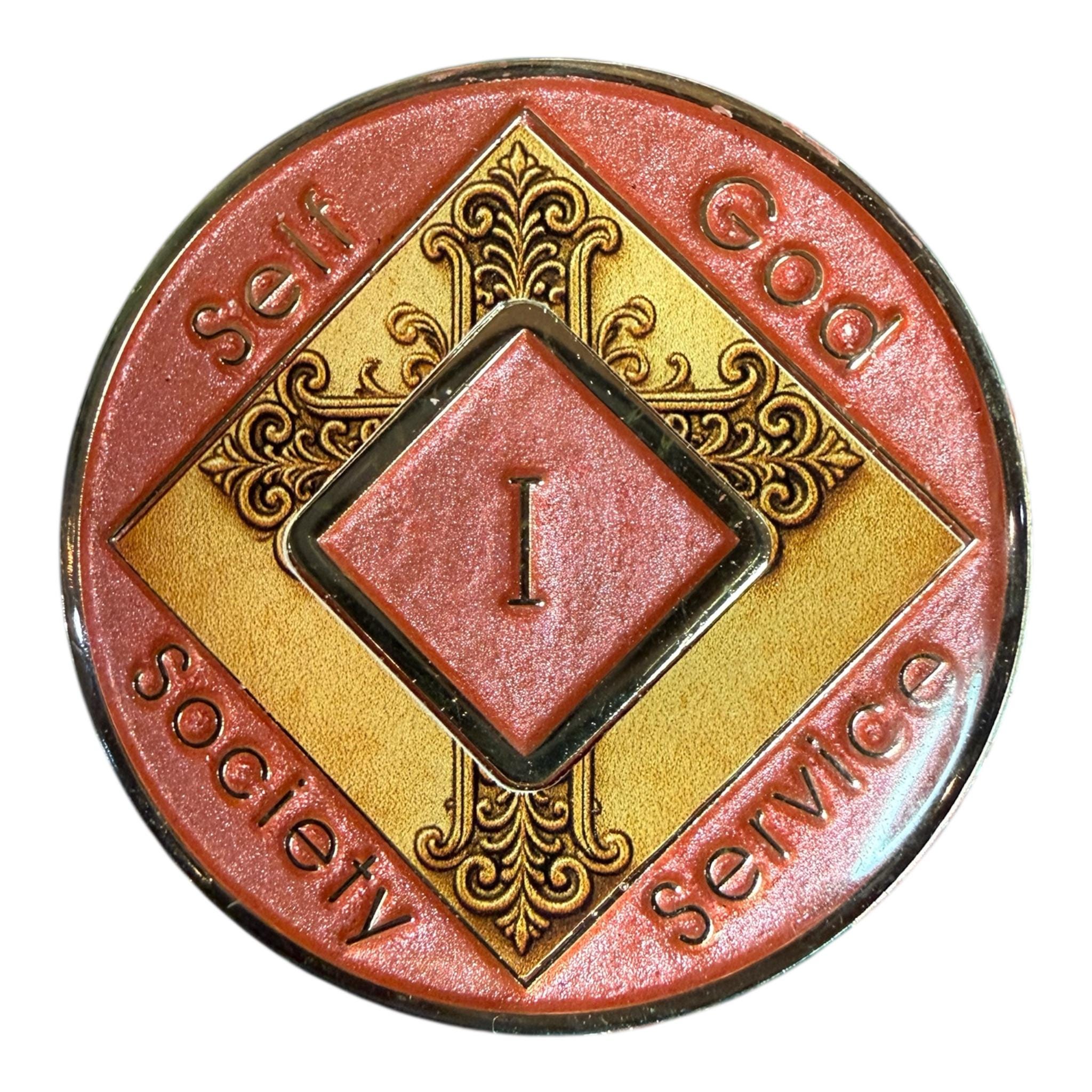 This unique Narcotics Anonymous medallion showcases a richly detailed golden cross set within the classic NA framework. Surrounded by the guiding principles — Self, God, Society, and Service — this design speaks directly to those whose recovery journey is rooted in faith and inner strength.