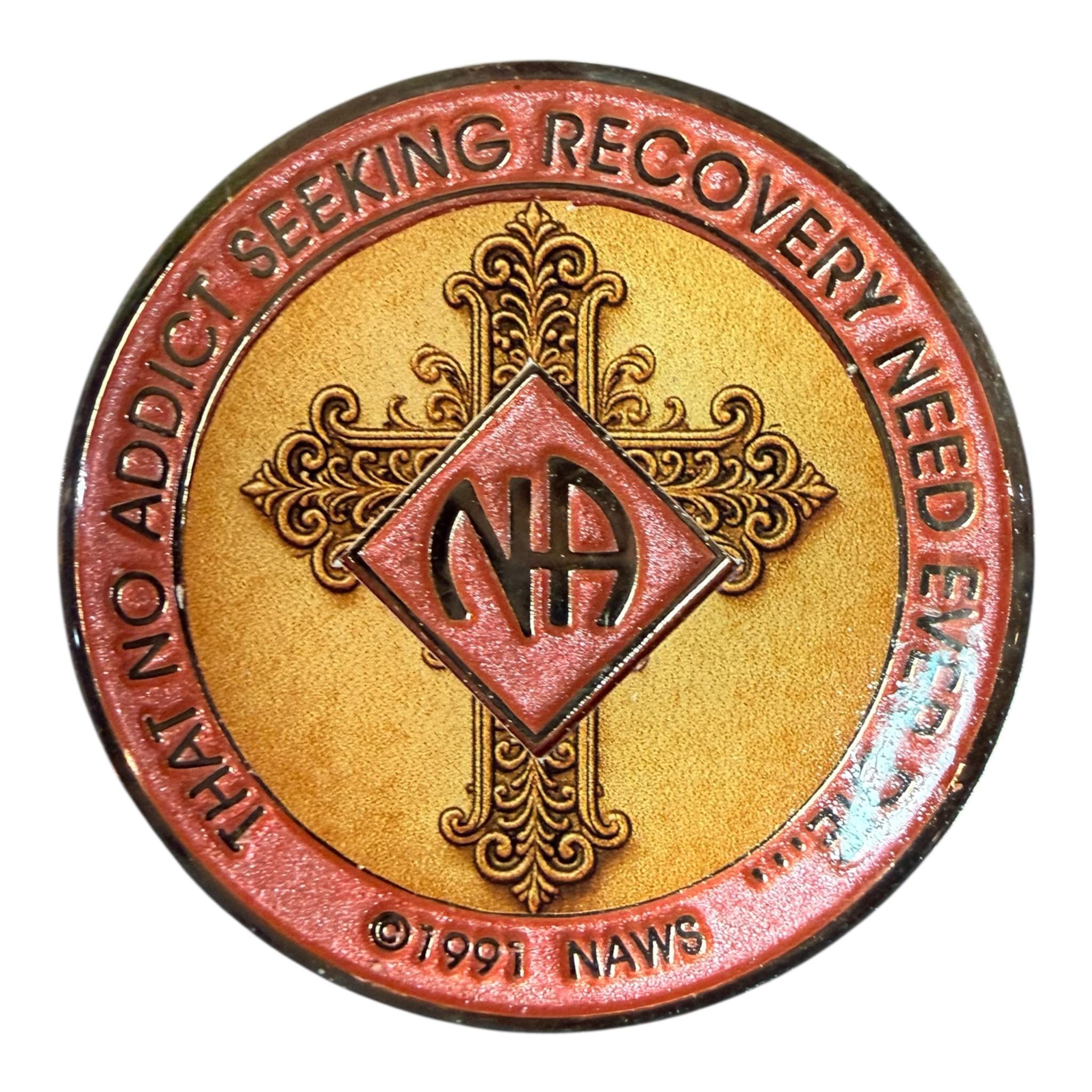 On the back, the powerful message “That no addict seeking recovery need ever die…” sits beneath the NA symbol overlaid on the same ornate cross, offering both inspiration and spiritual grounding.