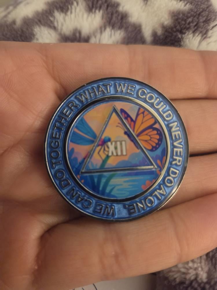 This vibrant AA Recovery Coin features a serene lakeside scene with a dragonfly and butterfly in flight — symbols of transformation, renewal, and freedom. Set beneath a colorful sky, the image captures the beauty of change and the gentle strength found through recovery. Surrounding the artwork is the phrase “We can do together what we could never do alone” — a heartfelt tribute to the support of the fellowship.