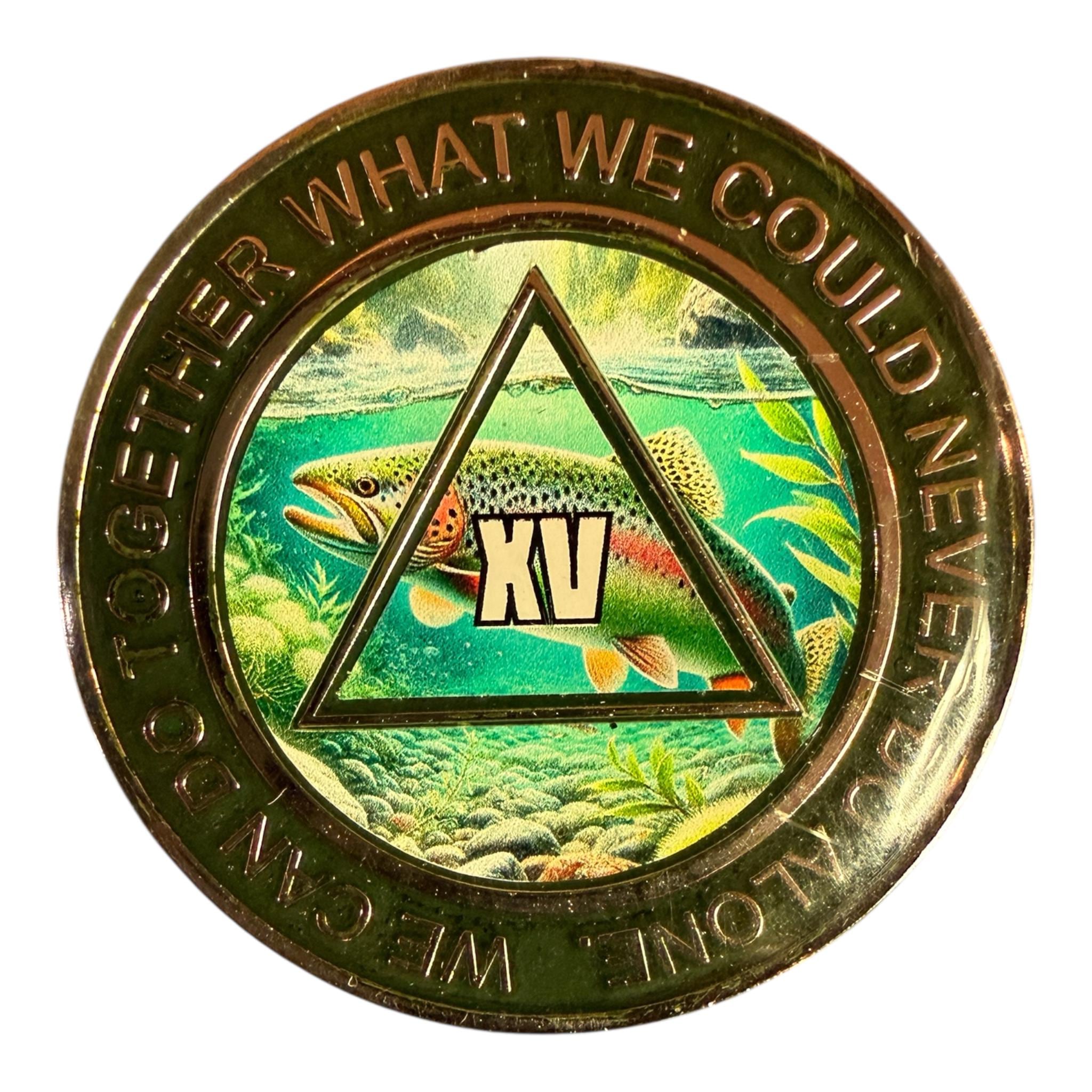 This distinctive AA medallion showcases a colorful rainbow trout gliding through clear, flowing water—a powerful symbol of freedom, clarity, and steady progress in recovery. Ideal for outdoor enthusiasts, fishing lovers, or anyone who feels restored by nature, this design beautifully reflects the spirit of taking life one day at a time.