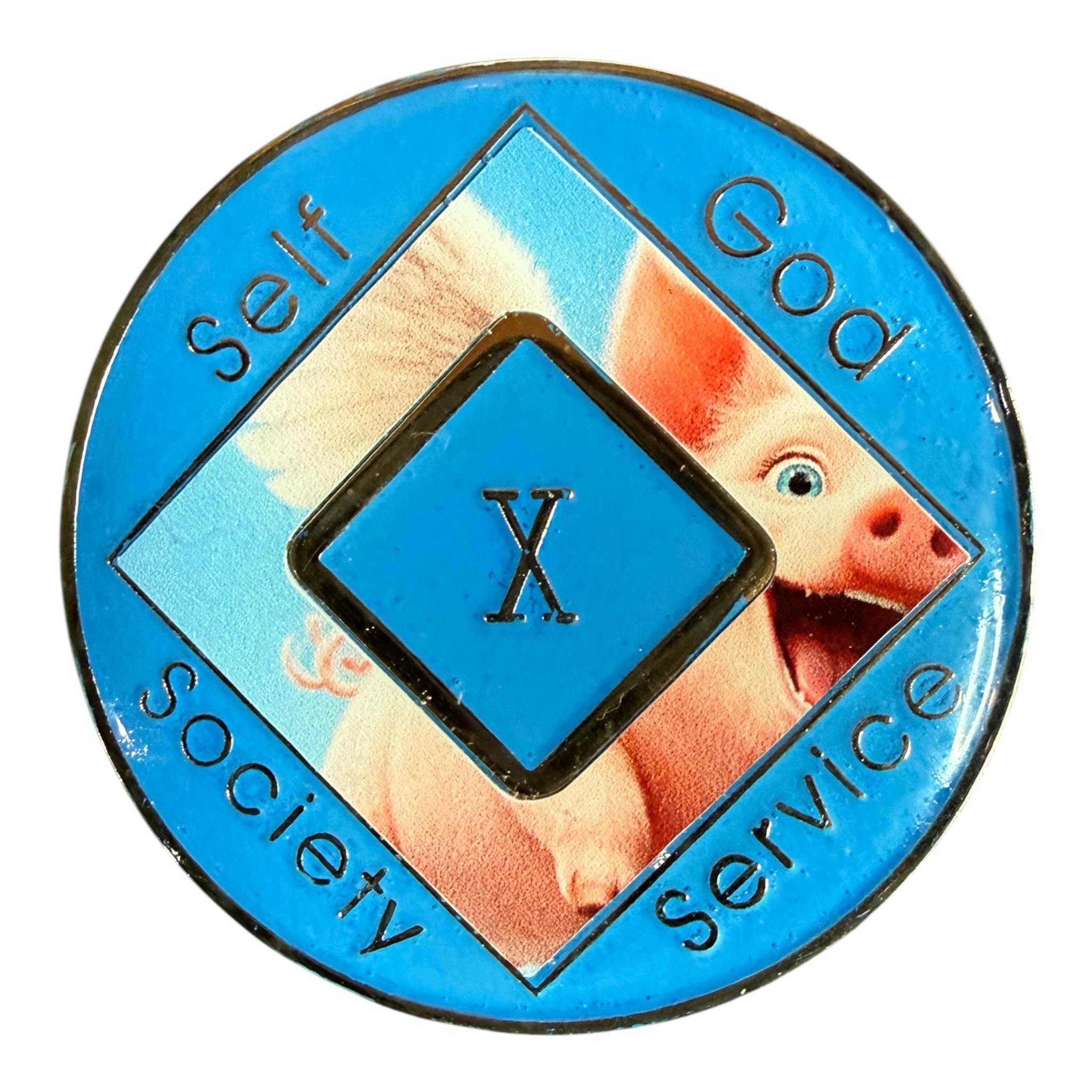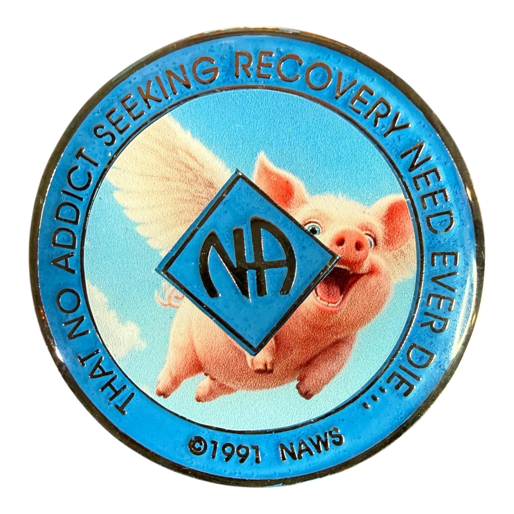 This NA medallion features a flying pig, symbolizing the impossible becoming reality—just like recovery. Funny and meaningful, this 34mm token is customized with your clean time number and sealed in resin for a durable finish. A playful gift to celebrate sobriety milestones with laughter and pride.