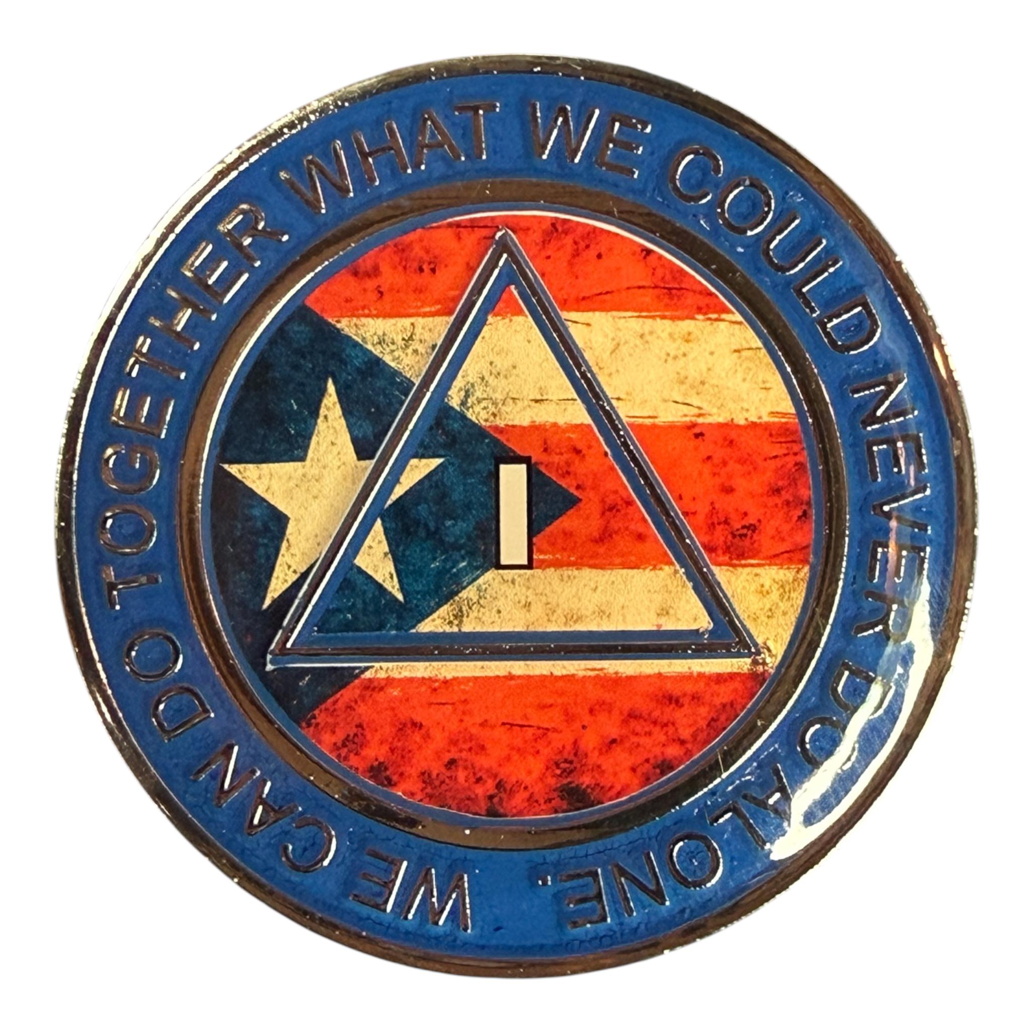 This recovery medallion features a weathered Puerto Rican flag behind the AA triangle. A bold and inspiring chip honoring clean time, identity, and unity.