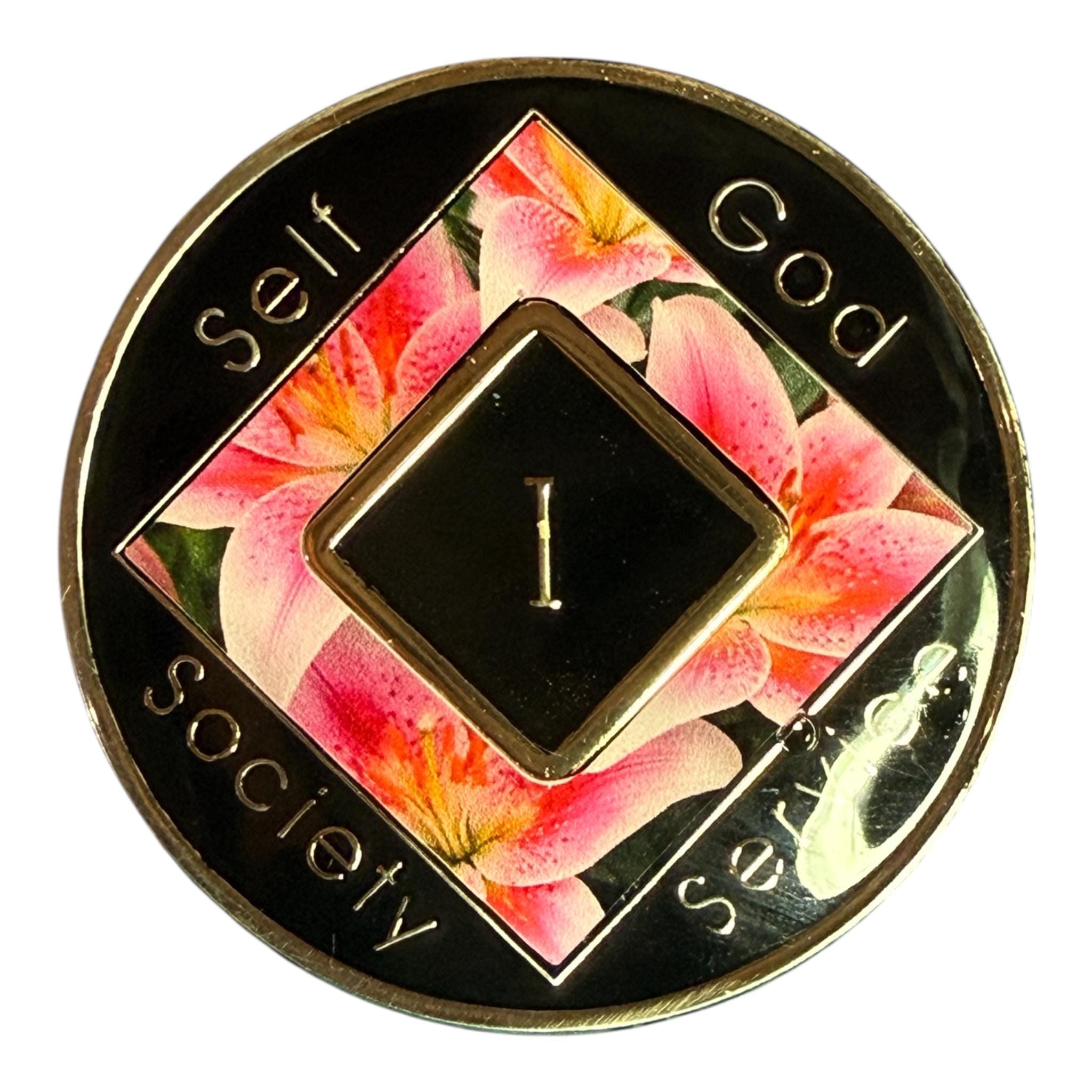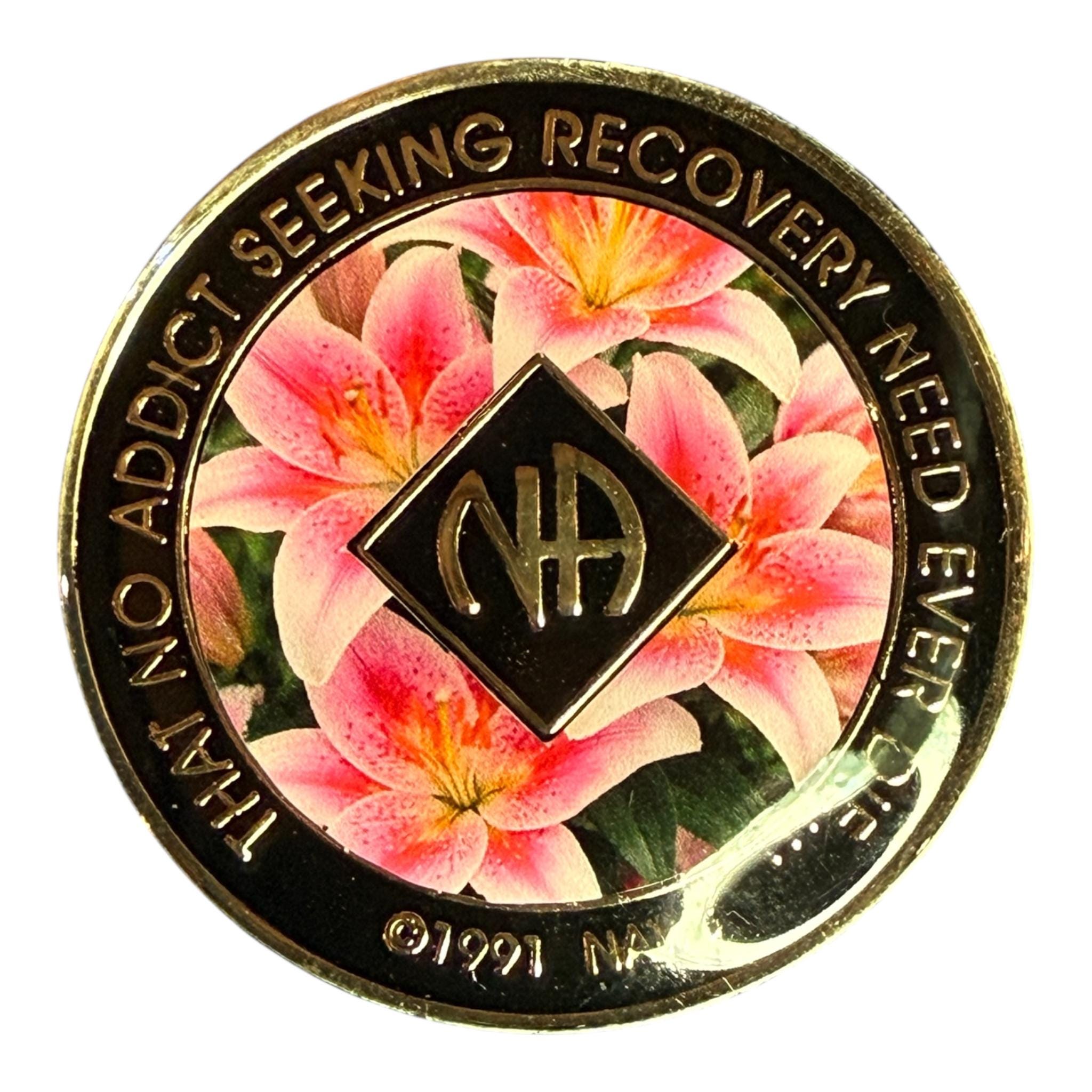 Celebrate recovery with this striking NA medallion featuring vibrant pink lilies in full bloom — a powerful symbol of renewal, hope, and the beauty of a new beginning.