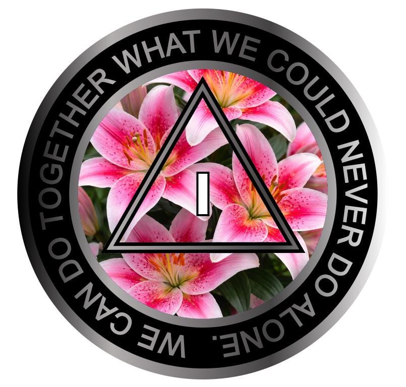 Celebrate recovery with strength and grace. This AA medallion features a radiant cluster of pink lilies—symbols of renewal, beauty, and rebirth—set within the classic triangle and circle design of Alcoholics Anonymous. On the reverse side, the full Serenity Prayer is presented in soft grayscale tones.