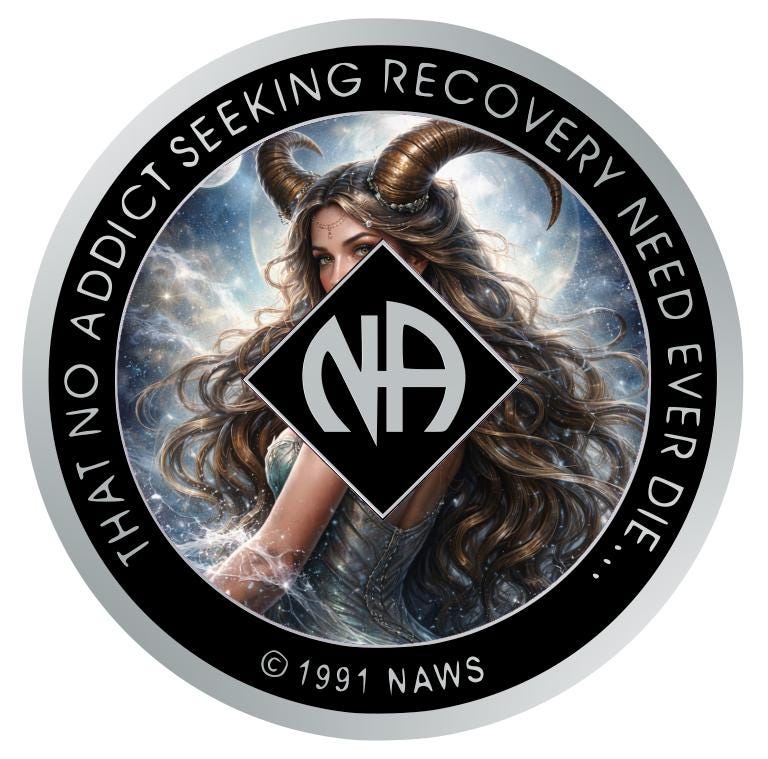 Celebrate your recovery journey with this Capricorn-themed NA medallion, honoring the grounded resilience and quiet strength of those born under the sign of the goat. This unique piece features a celestial goddess adorned with ram’s horns, surrounded by a starlit sky and ethereal lunar glow. Her steady gaze and flowing hair reflect the patience, wisdom, and determination that define Capricorn energy—making this medallion a powerful symbol of growth, structure, and self-mastery.