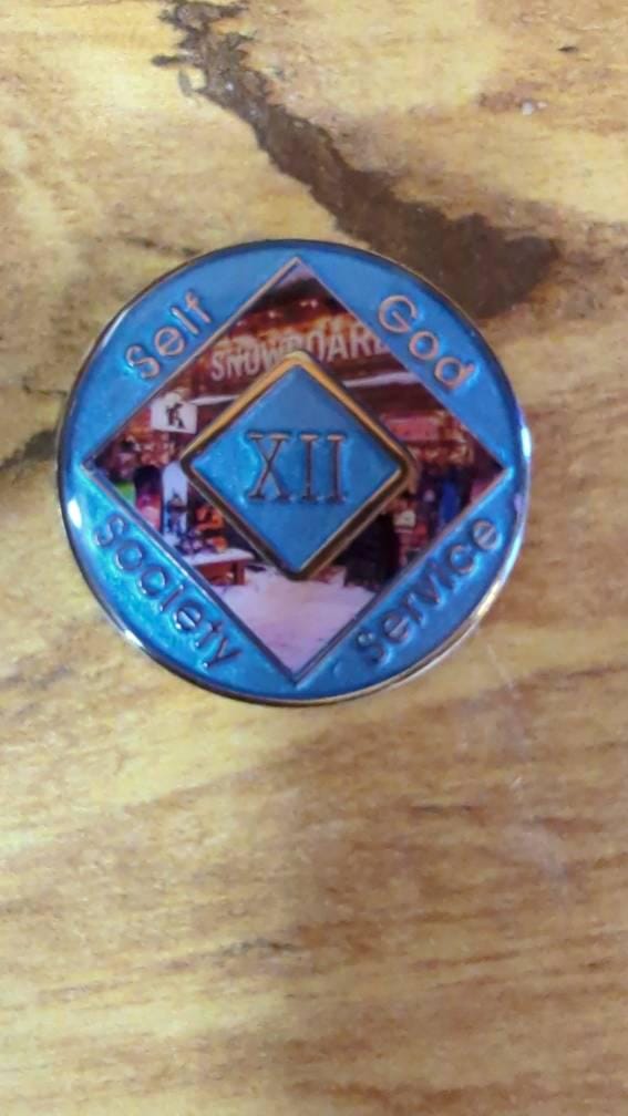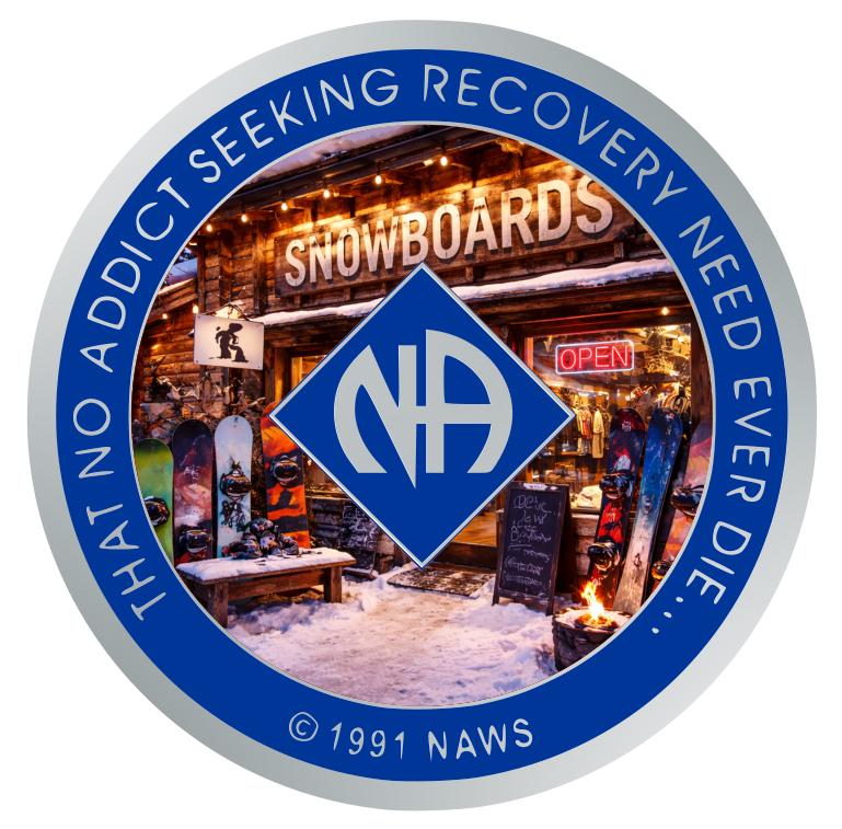 Celebrate your clean time with this unique NA medallion featuring a vibrant snowboard shop scene. Surrounded by snow and warmth, the design symbolizes the freedom and thrill that recovery brings—like carving fresh tracks on a new slope. The classic NA symbol overlays a cozy mountain-town storefront, glowing with life and possibility.