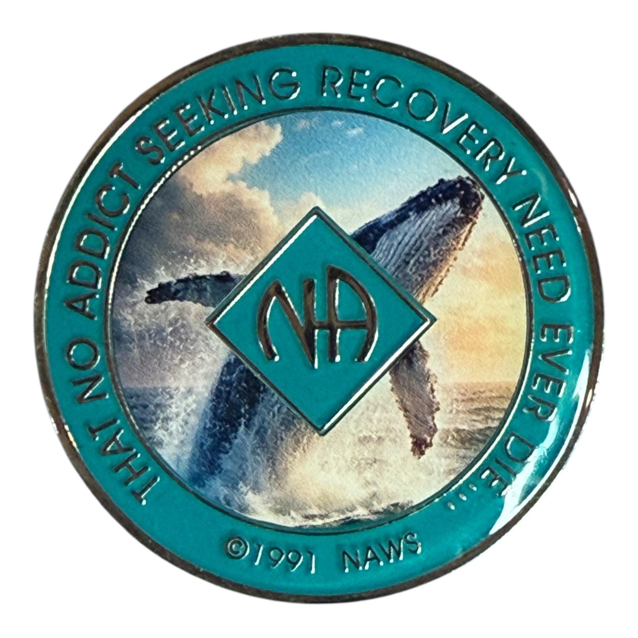 Whale-Themed NA Medallion – Ocean Strength Recovery Chip with “That No Addict…” Back