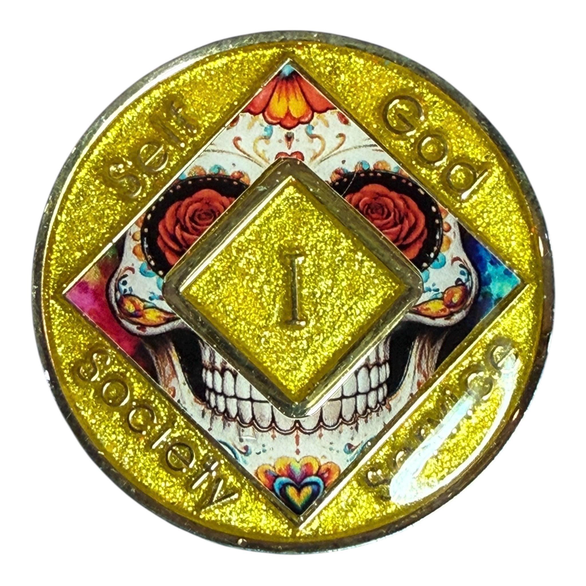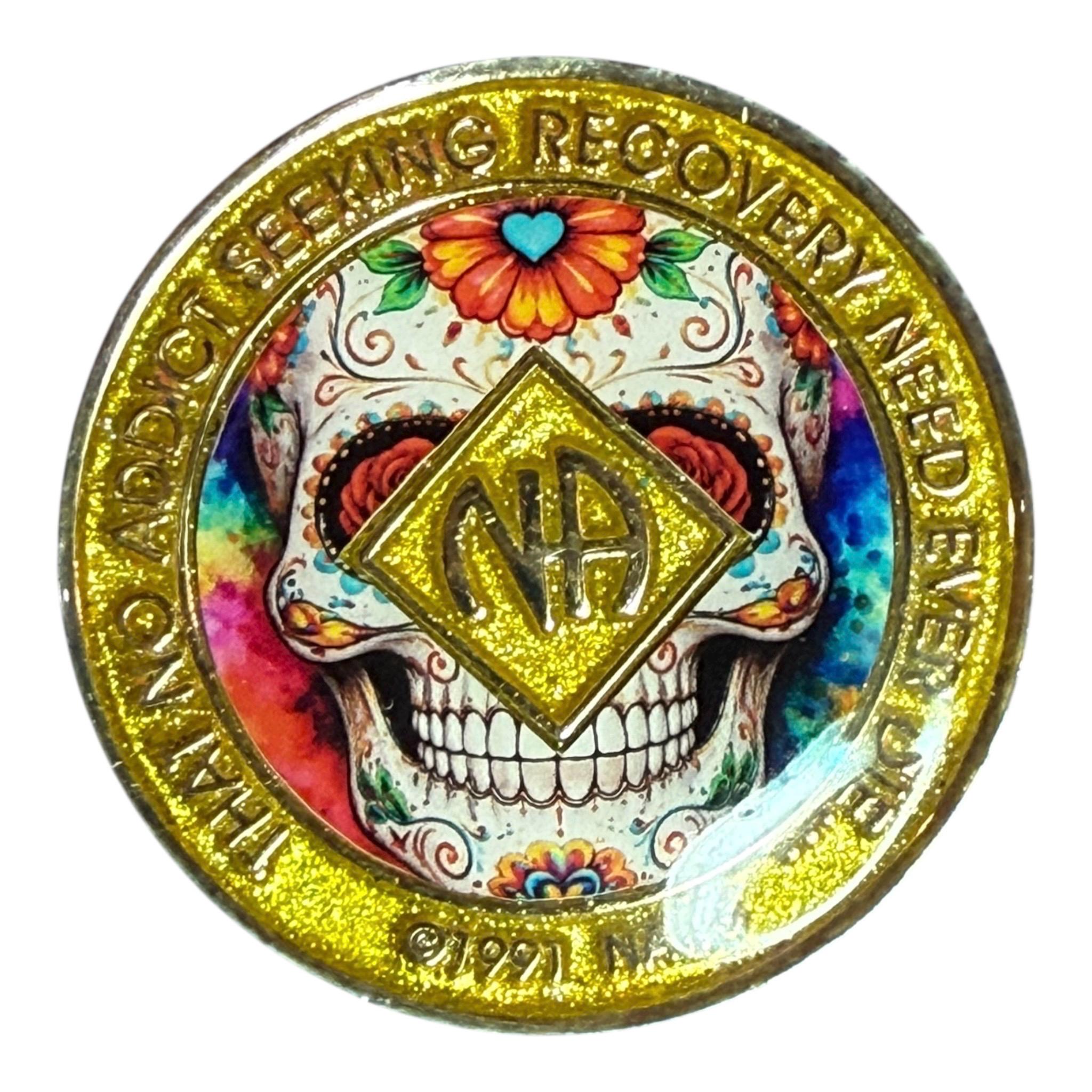 This bold and vibrant Narcotics Anonymous medallion showcases an intricately detailed sugar skull inspired by Día de los Muertos traditions. Accented with vivid roses, ornate floral patterns, and radiant colors, this striking design symbolizes remembrance, rebirth, and the celebration of life after darkness.