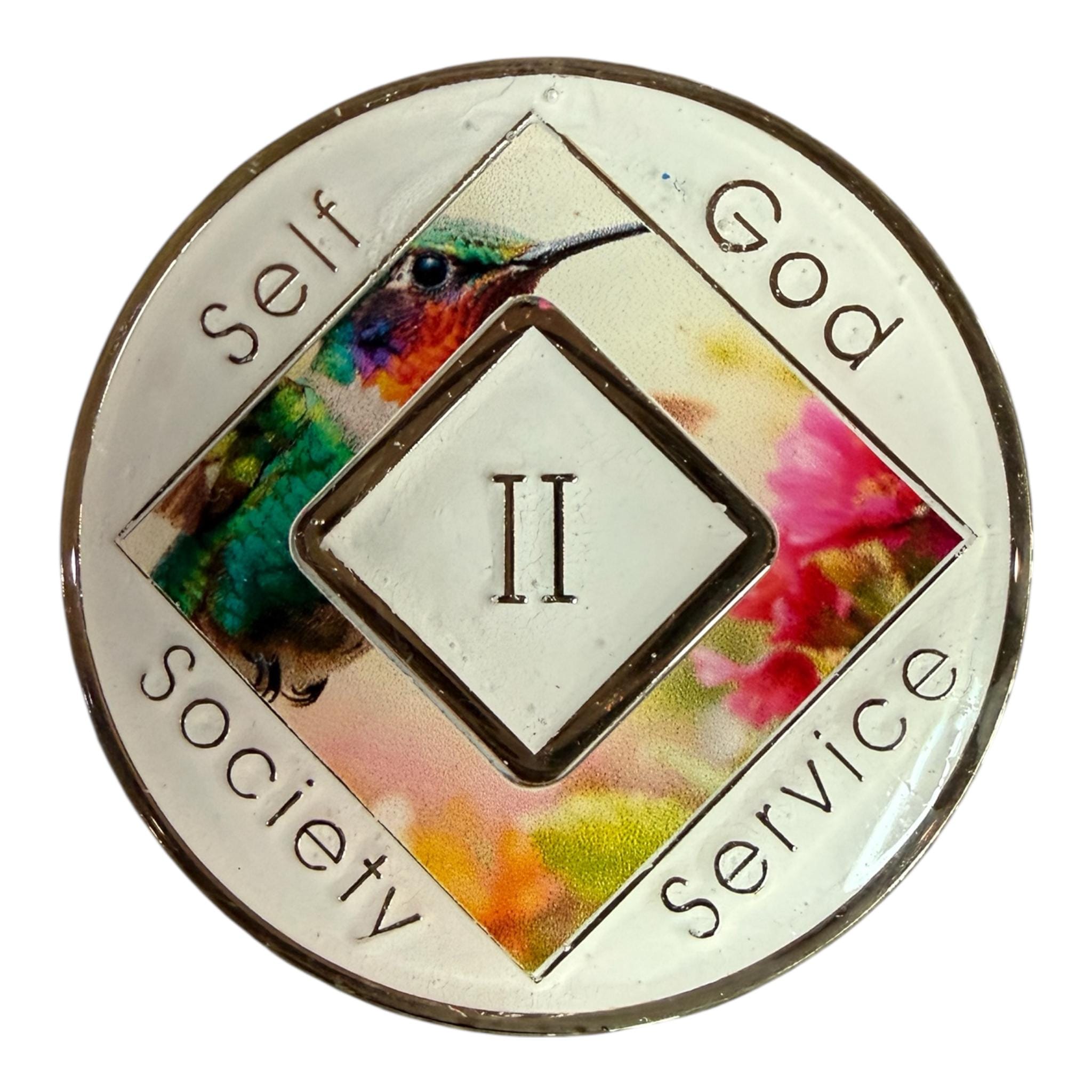 This vibrant Narcotics Anonymous medallion showcases a graceful hummingbird hovering near bright blossoms—a symbol of resilience, joy, and rediscovering life’s sweetness. Though small in size, the hummingbird embodies strength, determination, and remarkable endurance, making it a perfect reflection of the recovery journey.