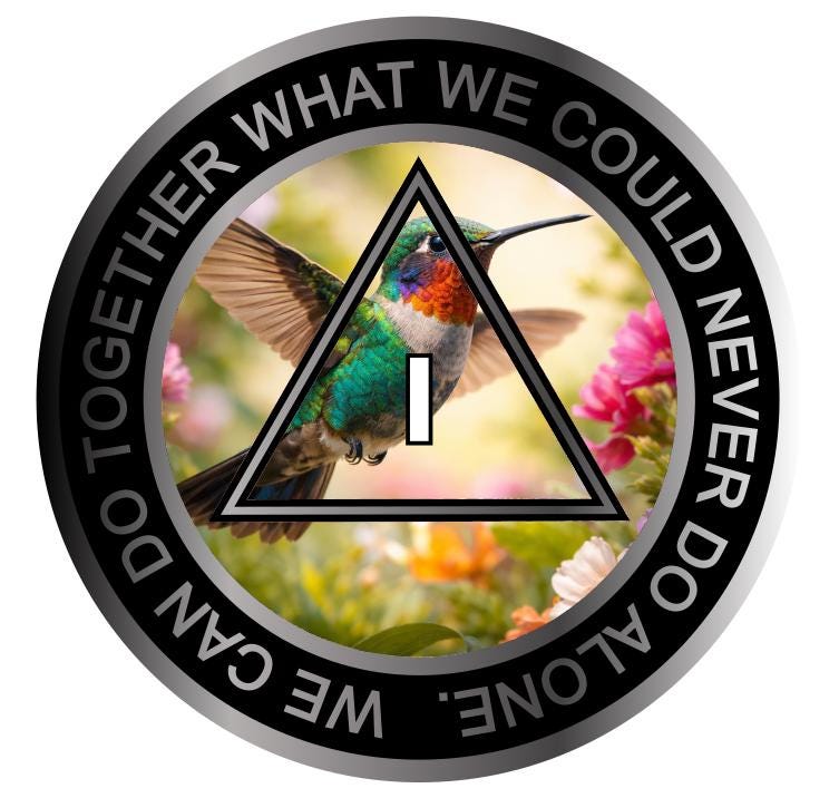 This vibrant Alcoholics Anonymous medallion showcases a graceful hummingbird hovering near bright blossoms—a symbol of resilience, joy, and rediscovering life’s sweetness. Though small in size, the hummingbird embodies strength, determination, and remarkable endurance, making it a perfect reflection of the recovery journey.