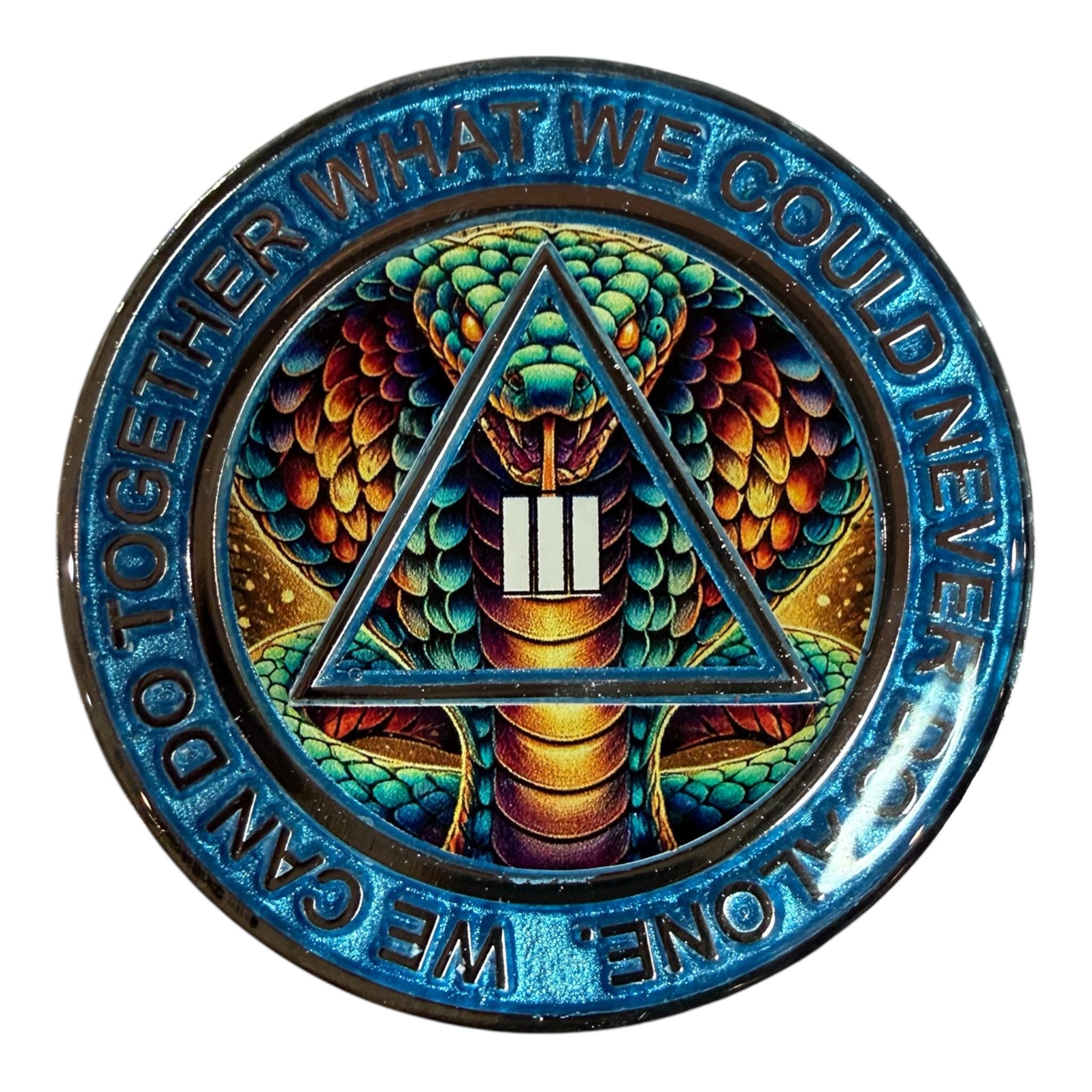 This striking Alcoholics Anonymous medallion showcases a vividly detailed cobra with its hood flared and gaze unwavering—a bold symbol of transformation, awareness, and inner strength. Across many traditions, the cobra represents protection, rebirth, and elevated consciousness, making it a powerful reflection of the courage and growth found along the recovery journey.