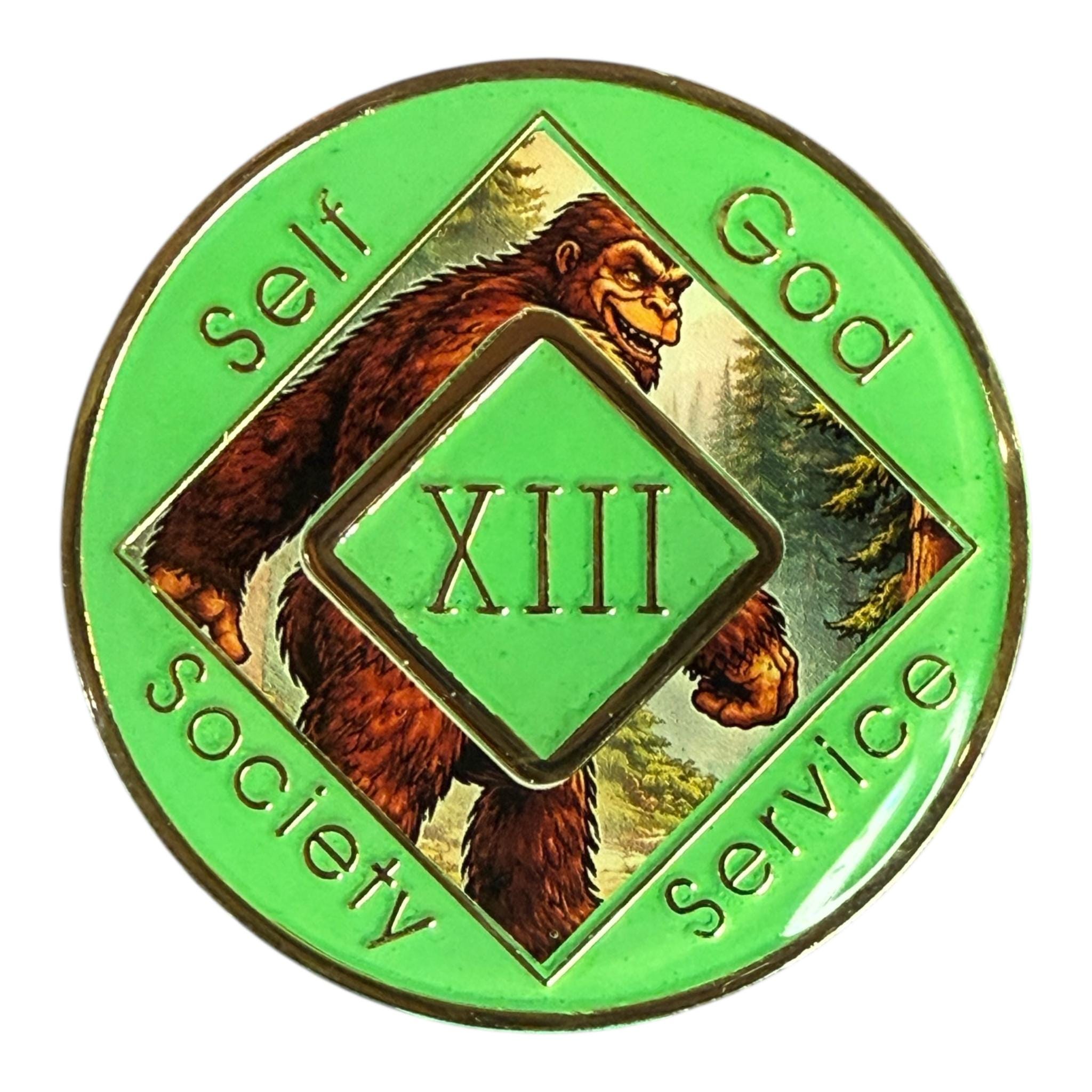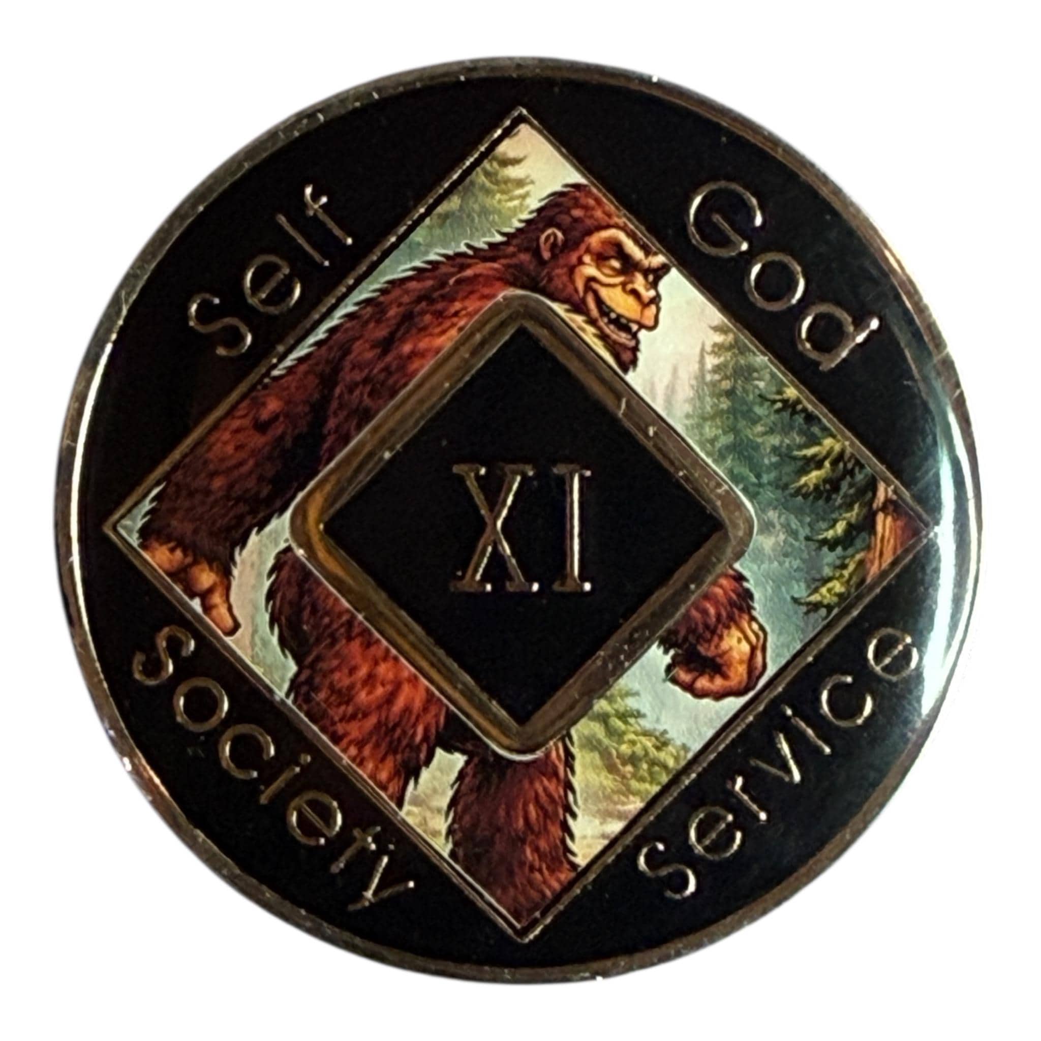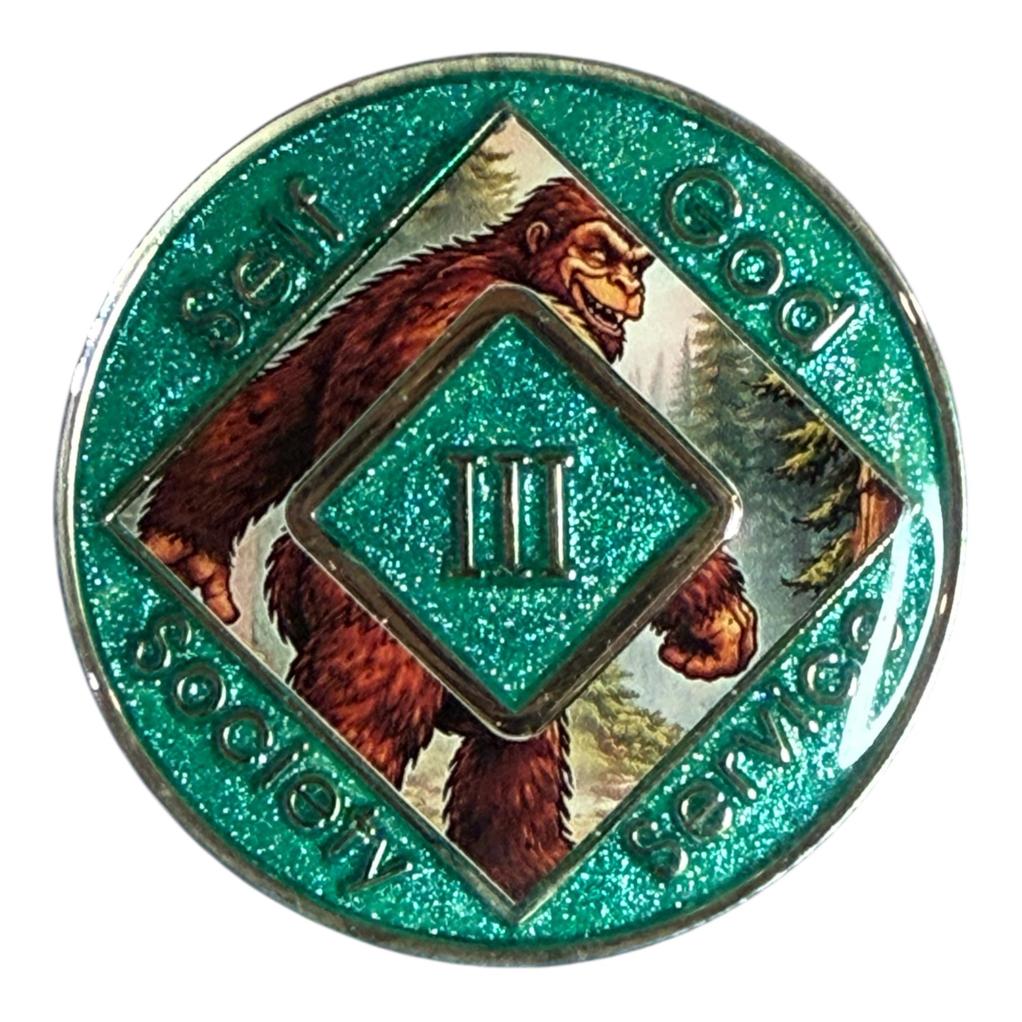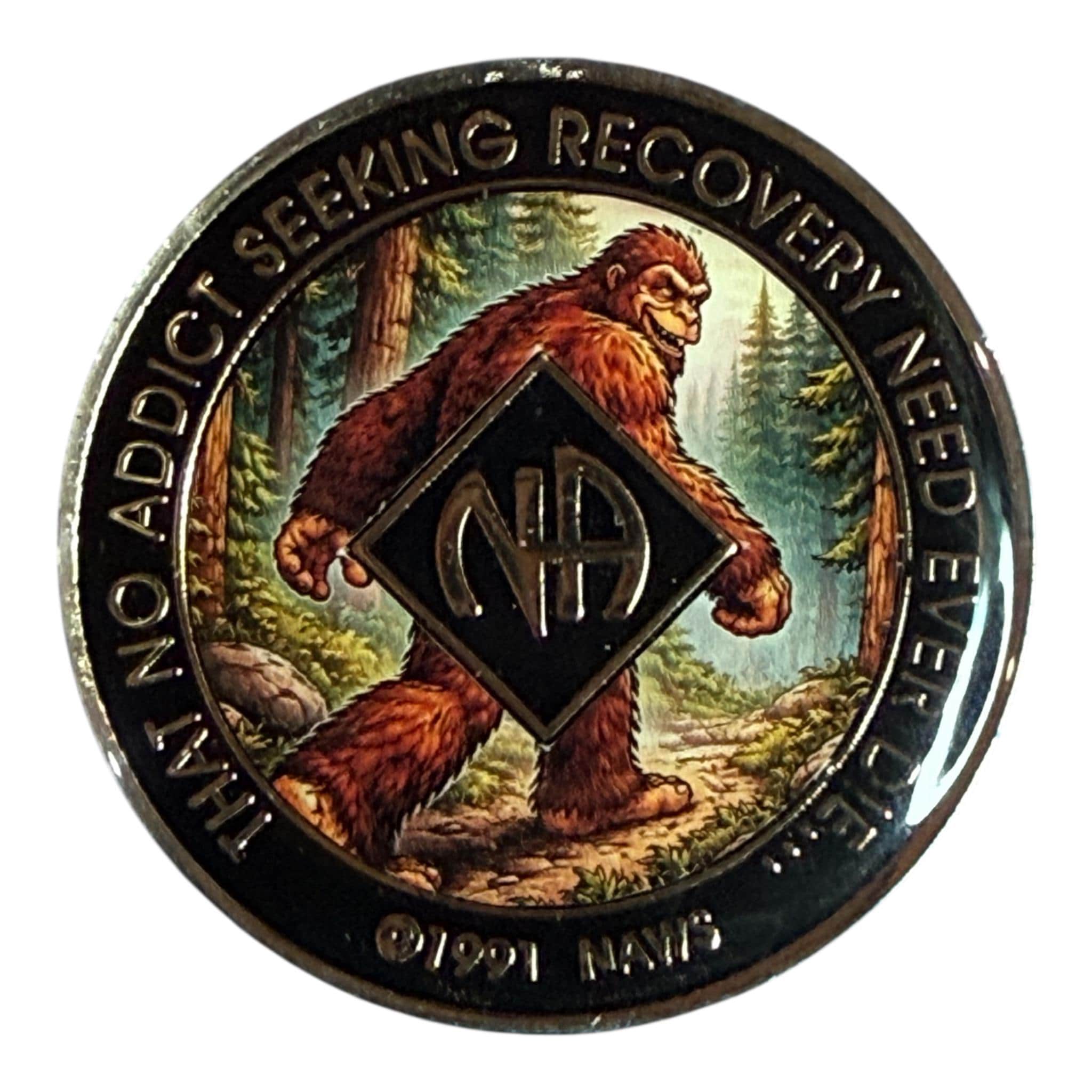 This Narcotics Anonymous medallion features a bold Bigfoot striding confidently through a forest landscape. The strong, steady figure symbolizes perseverance and independence on the recovery journey. Moving forward through any terrain, it represents resilience and determination. A powerful reminder to keep going, one step at a time.