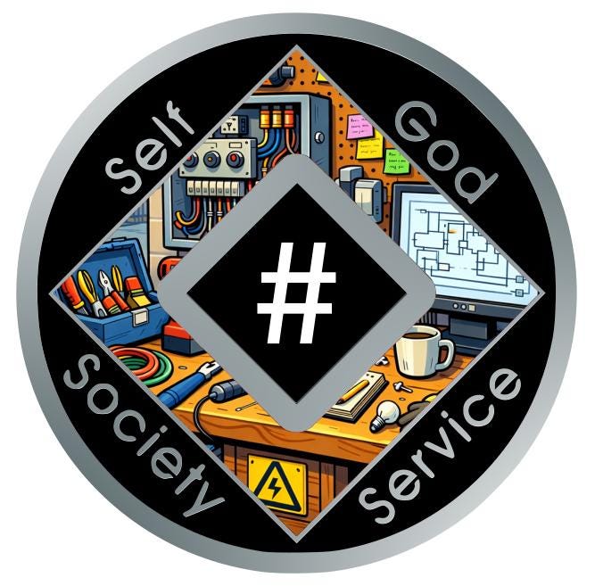 This Narcotics Anonymous medallion features a detailed electrician’s workstation — tools, wiring, schematics, and a hard hat — representing discipline, skill, and the daily work required to build something that lasts.