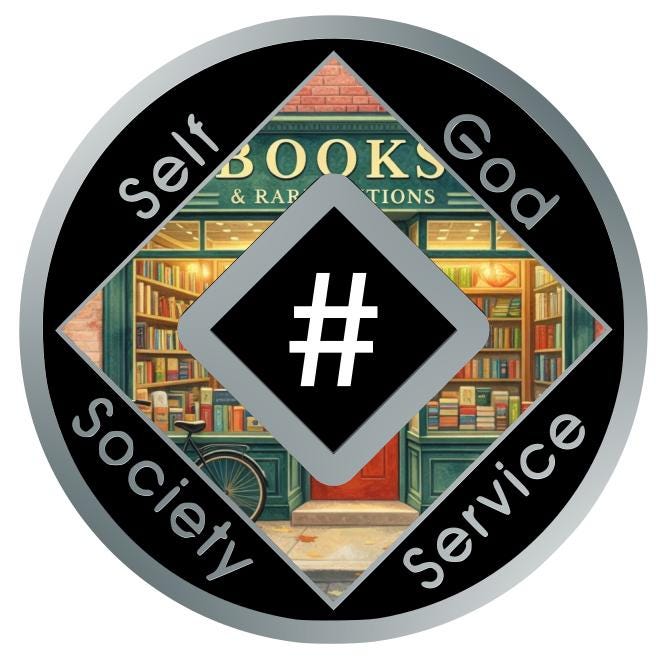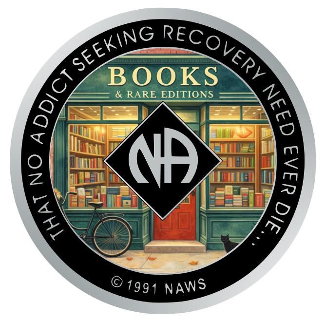 This Narcotics Anonymous medallion features a charming vintage bookstore filled with shelves of books and warm, inviting light. With a bicycle resting outside and a quiet storefront feel, this design represents growth, reflection, and the ongoing story of recovery.