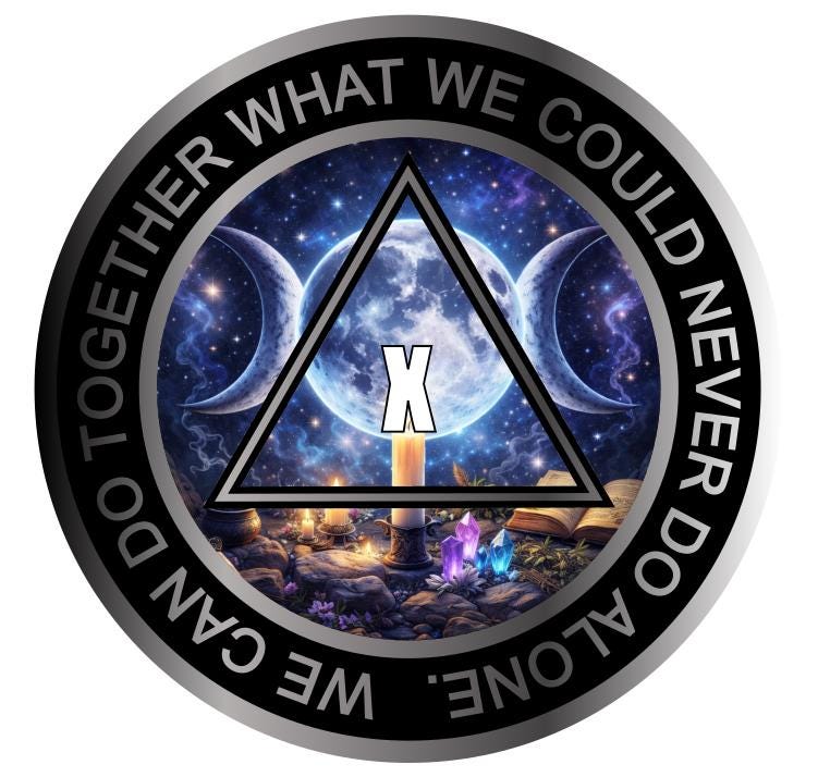 This Alcoholics Anonymous medallion features a stunning moon phase design with a radiant full moon centered among the stars, surrounded by candles, crystals, and an open book. The imagery reflects cycles of change, spiritual growth, and the constant evolution that comes with recovery.
